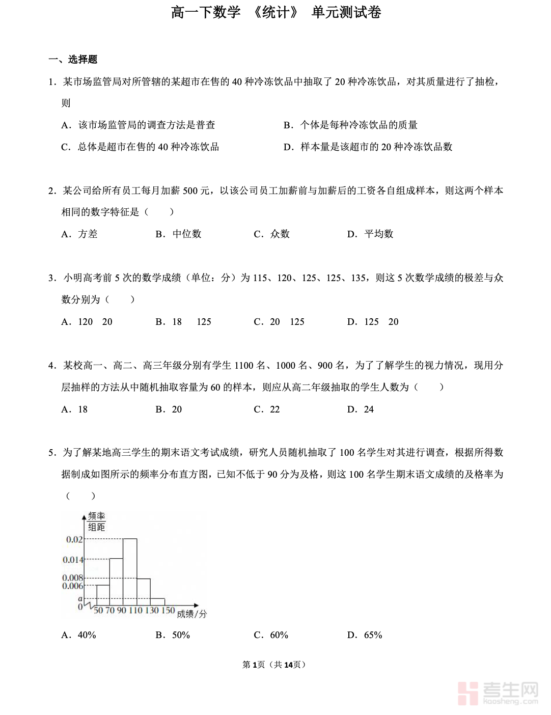 本文档是适配高一下数学《统计》单元的专项测试卷,严格依据人教版教材重难点与课程标准编写,全面覆盖随机抽样、数据整理、统计图表、样本数字特征(平均数、中位数、众数、方差、标准差)等核心考点。试卷题型丰富,包含选择题、填空题、解答题,难度梯度合理,注重基础与实际应用结合,贴合单元测评要求。既可用于学生自主检测、查漏补缺,也可用于教师课堂练习与学情反馈,帮助学生巩固统计知识、提升数据分析与解题能力,是高一下数学统计单元复习与检测的实用资料。