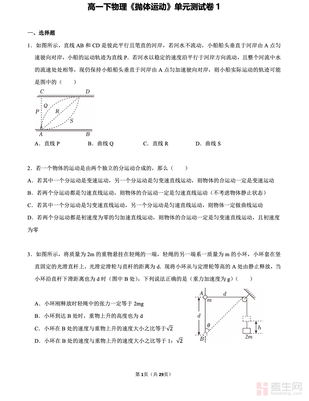 本文档是适配高一下物理《抛体运动》单元的专项测试卷,严格依据人教版教材重难点与课程标准编写,全面覆盖曲线运动条件、运动的合成与分解、平抛运动规律、斜抛运动基本分析等核心考点。试卷题型丰富,包含选择题、填空题、实验题、计算题,难度梯度合理,注重基础理解与规律应用,贴合课堂练习与单元测评要求。题目紧扣高频考法,侧重过程分析与公式应用,可用于学生自主检测、查漏补缺,也可作为教师单元验收、学情反馈使用。帮助学生巩固抛体运动解题思路,提升运动分解与计算能力,是高一下物理抛体运动单元复习与检测的实用资料。