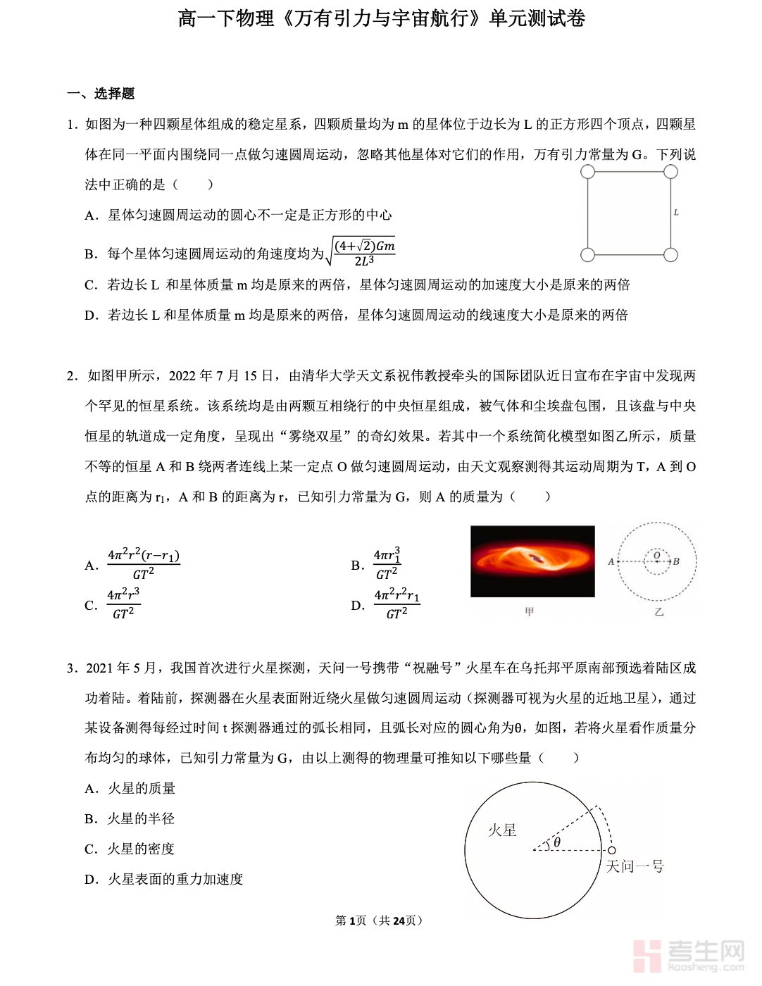 本文档是适配高一下物理《万有引力与宇宙航行》单元的专项测试卷,严格依据人教版教材重难点与课程标准编写,全面覆盖行星运动规律、万有引力定律、天体质量与密度计算、卫星运行、宇宙速度、变轨问题等高频考点。试卷题型完整,包含选择题、实验填空题、计算题,难度梯度合理,兼顾基础巩固与能力提升,贴合单元检测与期中复习要求。题目紧扣高考考法,侧重公式理解与模型应用,可用于学生自主测评、查漏补缺,也适合教师课堂练习与学情反馈,帮助学生强化天体运动解题思路,提升物理建模与运算能力,是高一下物理该单元复习与检测的实用资料。