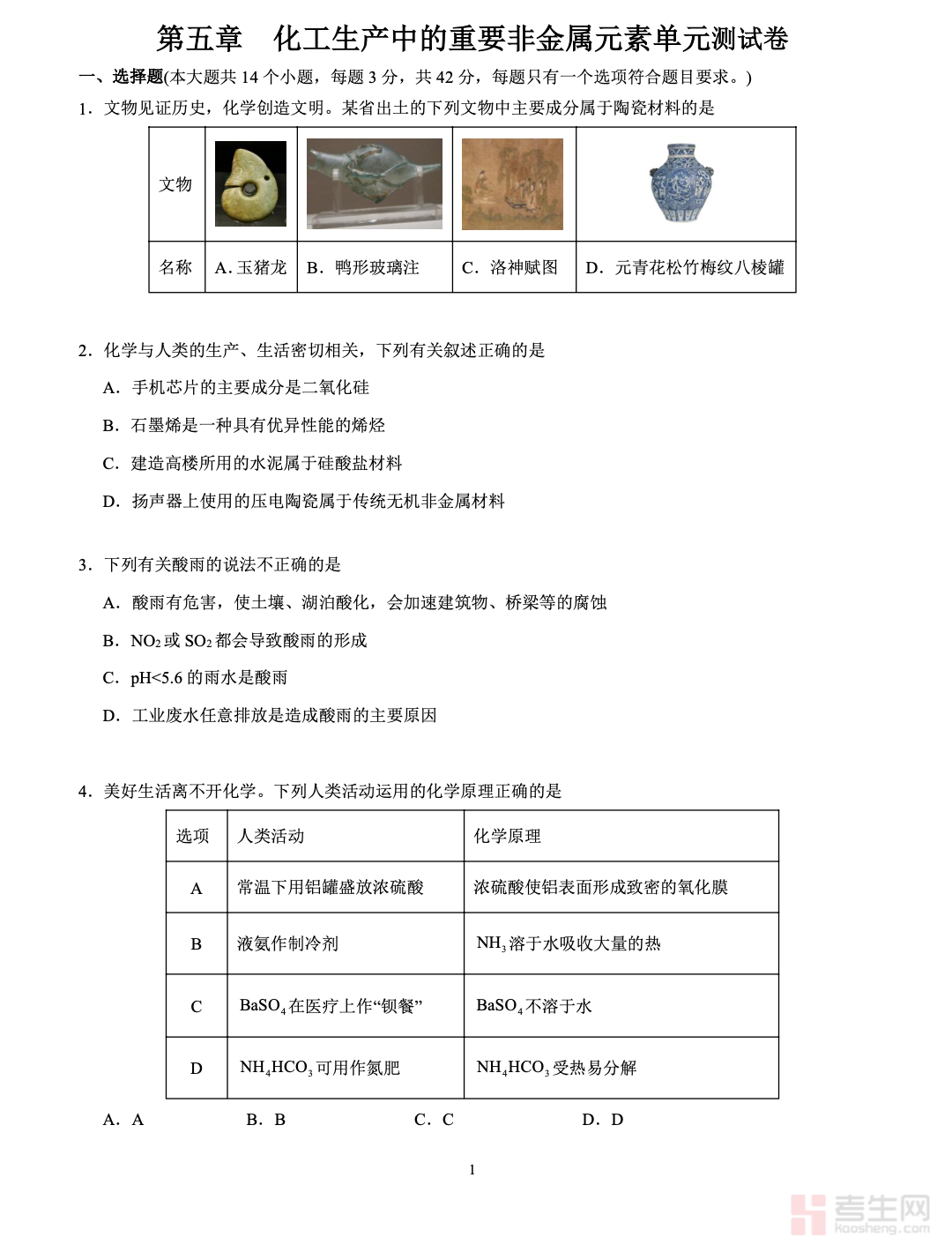 本文档是适配人教版高一下化学第五章《化工生产中的重要非金属元素》的单元测试卷,严格依据教材重难点与课程标准编写,全面覆盖硫、氮、硅、氯及其重要化合物的性质、转化关系、化学方程式、化工生产原理与环境保护等高频考点。试卷题型规范,包含选择题、填空题、实验题与计算题,难度梯度合理,侧重基础巩固与知识应用,贴合单元检测与期中复习要求。题目紧扣课堂考点与易错题型,可用于学生自主检测、查漏补缺,也可作为教师单元测评、学情反馈使用,帮助学生系统掌握非金属元素知识,提升化学解题与应试能力,是高一下化学第五章复习测评的实用资料。