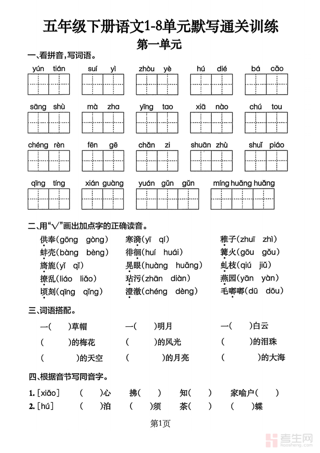 本文档为五年级下册语文全册默写通关训练资料,紧扣部编版教材内容,系统梳理全册必背古诗词、课文重点语段、日积月累、生字词及关键语句等默写要点。按单元顺序编排,题型贴合课堂默写与单元检测要求,针对易错字、易混句、高频考点进行专项强化。内容全面、重点突出、实用性强,适合学生课后巩固、单元复习、期中期末考前训练使用,帮助学生夯实语文基础,提升背诵默写准确率,减少基础失分,是五年级下册语文必背内容过关、提升基础素养的实用默写资料。