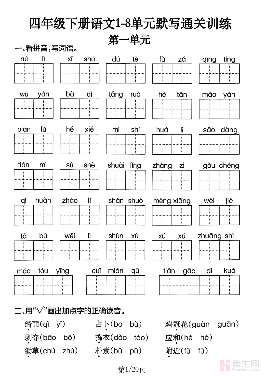 本文档为四年级下册语文全册默写通关训练资料,紧扣部编版教材同步内容,系统整理全册必背古诗词、重点课文片段、日积月累、生字词及关键语句等默写核心内容。按单元顺序编排,题型贴合课堂默写与单元检测要求,重点针对易错字、易混句、高频考点进行专项强化练习。内容全面、重点清晰、实用性强,适合学生课后巩固、单元复习、期中期末考前训练使用,帮助学生夯实语文基础,提升背诵默写准确率,减少基础题型失分,是四年级下册语文必背内容过关、提升语文基础素养的实用默写资料。