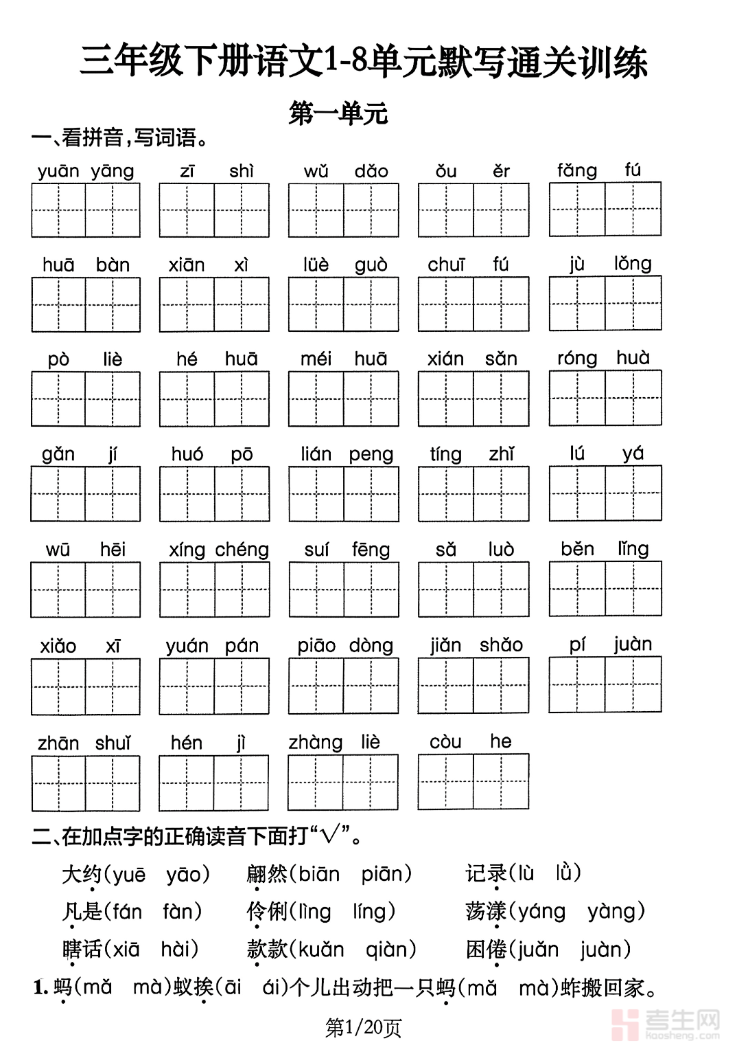 本文档为三年级下册语文全册默写通关训练资料,紧扣部编版教材同步内容,系统整理全册必背古诗词、课文重点句段、生字词语、日积月累及常考默写内容。按单元顺序编排,题型贴合课堂默写与单元检测要求,重点针对易错字、易混笔画、高频默写考点进行专项强化。内容基础实用、重点明确,适合学生课前预习、课后巩固、单元复习与考前练习,帮助孩子扎实掌握课本必背内容,提升默写正确率,减少基础失分,是三年级下册语文夯实基础、巩固识记的实用默写资料。
