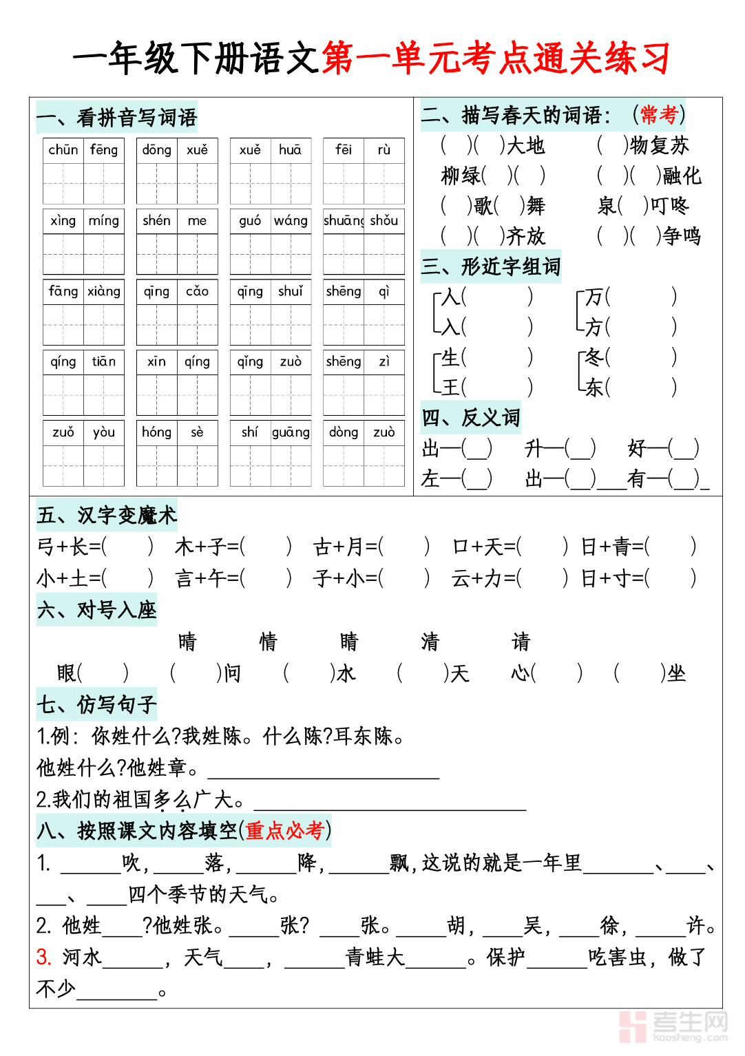 本文档为一年级下册语文全册默写通关训练资料,紧扣部编版教材同步内容,系统整理全册生字、词语、重点句子、必背古诗、日积月累等基础默写内容。按单元顺序编排,题型贴合低年级课堂练习与单元检测要求,重点针对易错字、笔顺、形近字、同音字进行专项强化。内容简单实用、重点清晰,适合学生课前预习、课后巩固、单元复习与考前练习,帮助孩子夯实语文基础,提升识字写字与背诵默写能力,减少基础题型失分,是一年级下册语文巩固识记、过关必背内容的实用默写资料。