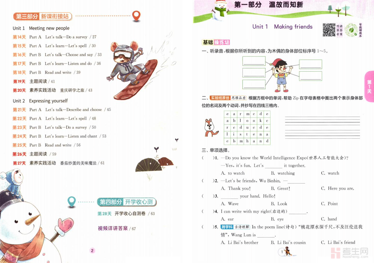 本文档为 26 春《实验班寒假衔接》人教 PEP 版三年级英语配套资料,专为小学三年级寒假学习设计,同步教材内容,采用 “温故知新 — 寒假提优 — 新课衔接 — 开学收心测” 四步模式。内容覆盖上学期核心词汇、重点句型、基础语法与听力训练,针对性巩固旧知、突破易错点;同步衔接下学期新课内容,帮助学生提前预习、平稳过渡。题型贴合小学英语考查要求,难度适中、实用性强,可用于寒假每日练习、自主检测与查漏补缺,助力学生夯实英语基础、提升听说读写能力,是三年级寒假英语复习与预习的实用资料。