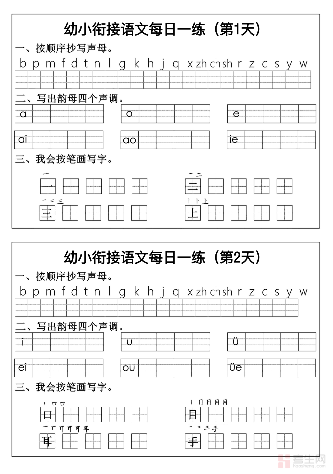 本文档为【幼小衔接】语文拼音生字每日一练 24 天(共 12 页),专为幼小衔接阶段孩子设计,按 24 天科学规划学习节奏,内容涵盖基础拼音、简单生字认读与规范书写。每天练习量适中,由浅入深,贴合低龄儿童学习规律,帮助孩子稳步掌握拼音发音、声调及生字笔顺,提升认读和书写能力。页面排版清晰、护眼易写,方便打印使用,适合幼儿园课堂练习、家庭每日打卡、幼小衔接专项巩固。坚持练习可有效培养孩子学习习惯,夯实语文基础,为顺利进入小学做好准备,是实用性强的拼音生字启蒙学习资料。
