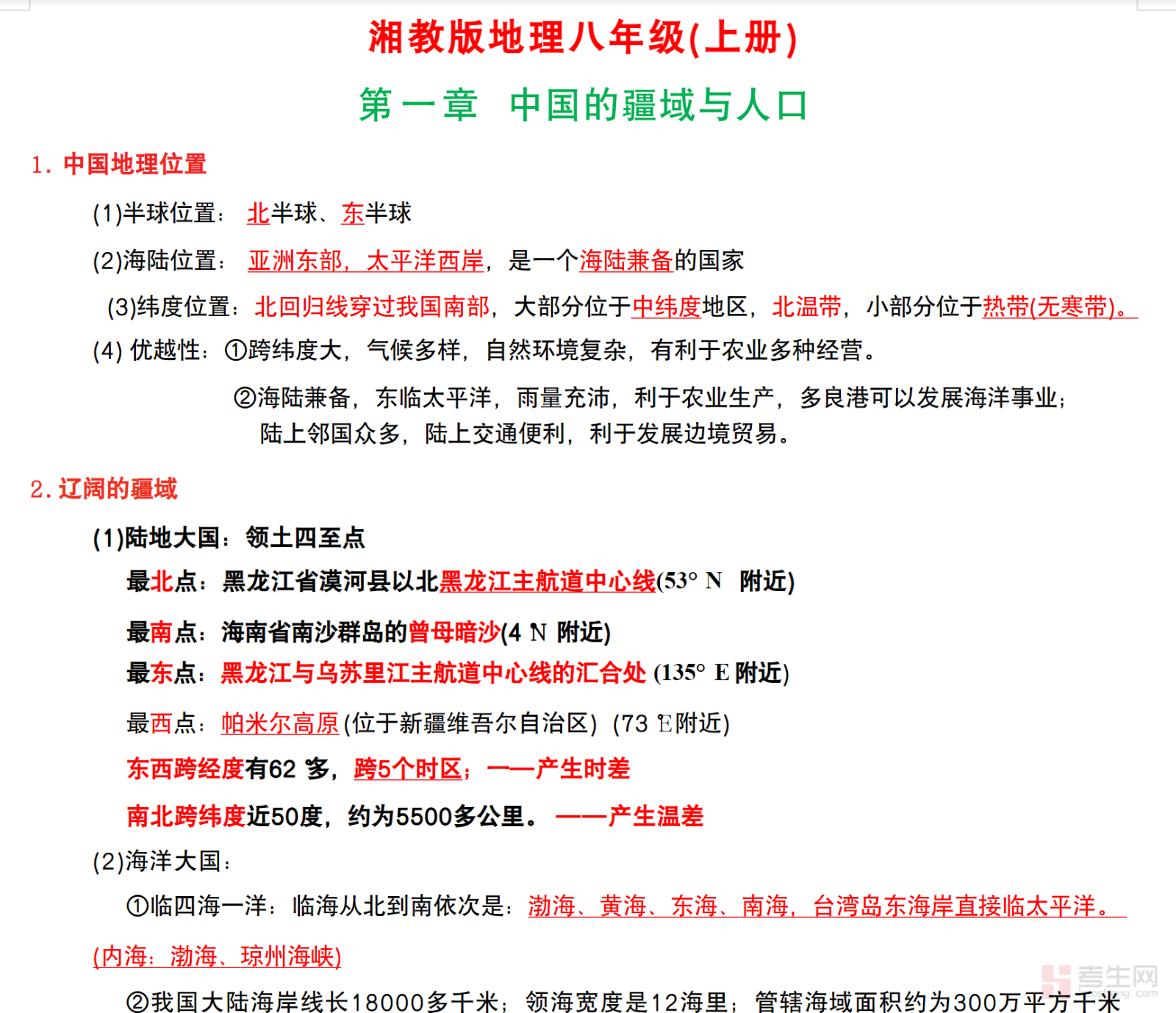 内容完整覆盖教材全部章节,精准对标课堂教学重点,主要包含四大核心模块:中国的疆域与人口(疆域范围、行政区划、人口分布与民族特点)、中国的自然环境(地形地势、气候、河流与湖泊、自然灾害)、中国的自然资源(土地资源、水资源的分布与合理利用)、中国的经济发展(交通运输、农业、工业的分布与发展)。