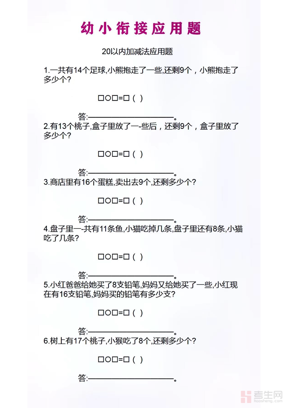 本文档为【幼小衔接】应用题练习资料,专为幼儿园大班及幼小衔接阶段孩子设计,贴合小学低年级数学入门要求,内容以简单易懂的生活场景为主,涵盖求和、求差、比较等基础应用题题型。题目语言浅显、图文结合,帮助孩子理解题意,学会把数学知识用到实际生活中,锻炼逻辑思维、审题能力和简单计算能力。题型由浅入深、题量适中,页面排版清晰,方便孩子练习和家长辅导,可用于课堂训练、课后巩固、幼小衔接数学提升。既能夯实数学基础,又能培养孩子思考问题和解决问题的习惯,为顺利过渡小学做好准备,是实用性强的幼小衔接应用题启蒙资料。
