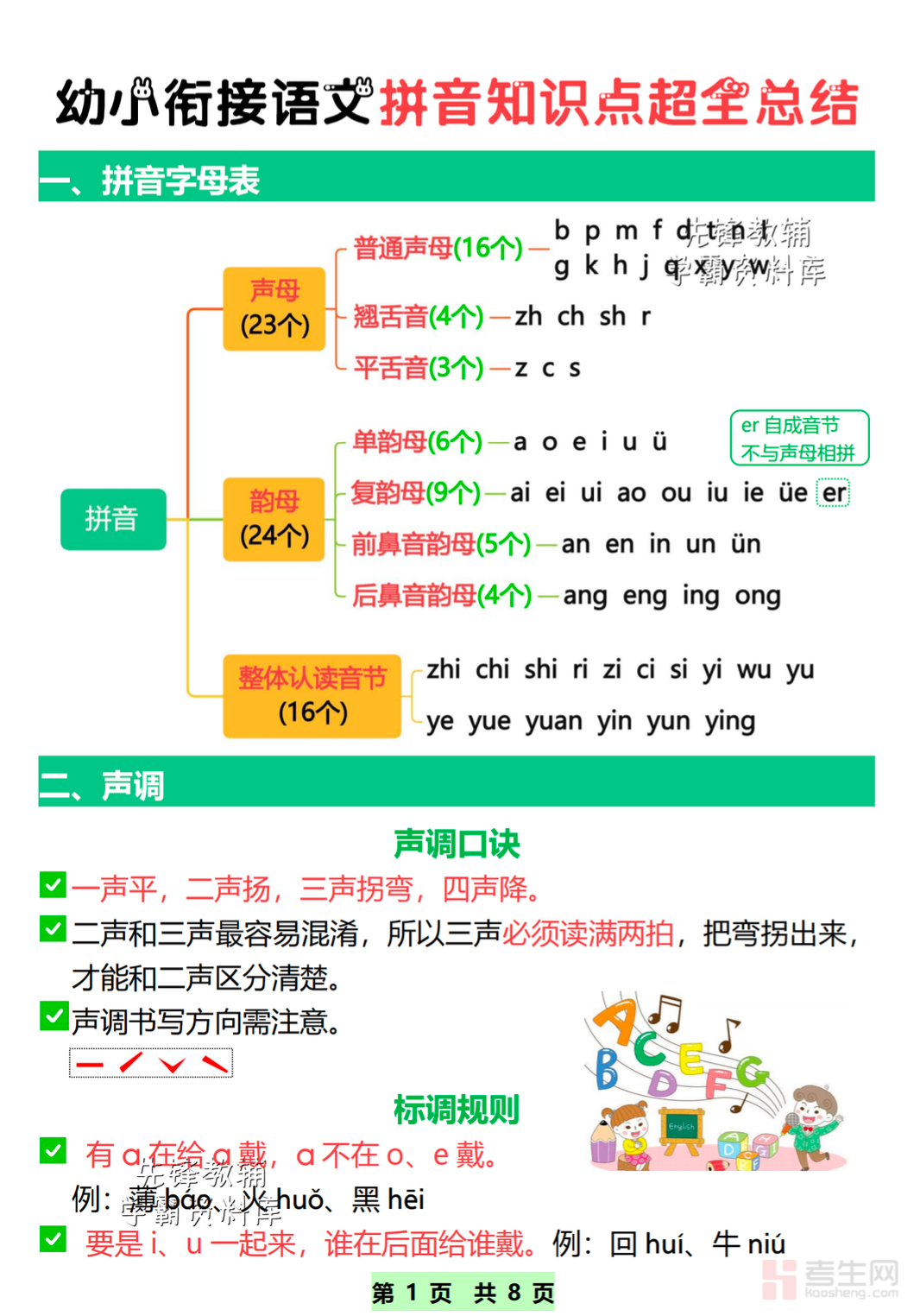 本文档为【幼小衔接】语文拼音知识点超全总结,专为幼儿园大班及幼小衔接阶段孩子整理,内容全面系统,涵盖声母、韵母、整体认读音节、声调、拼读规则等核心知识点,归纳清晰、重点突出,方便孩子快速掌握和记忆。资料排版简洁明了、易读易懂,贴合低龄儿童学习特点,既能用于日常复习巩固,也适合家长辅导和老师教学使用。帮助孩子扎实打好拼音基础,提升认读、拼读能力,为顺利进入小学、学好语文做好充分准备,是实用性很强的幼小衔接拼音学习资料。