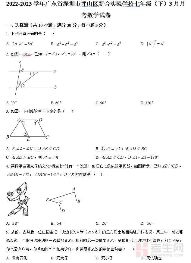 这是深圳市坪山区新合实验学校 2022-2023 学年七年级下学期 3 月月考数学试卷,贴合深圳本地教学进度,聚焦七年级下册开篇核心考点,题型规范、结构完整。试卷以基础考查为主,难度适中,贴合校内月考定位,能精准检测学生阶段性学习情况。试卷可用于同步练习、摸底自测与查漏补缺,帮助学生熟悉考法、巩固知识,是初一学生起步复习的优质训练资料。