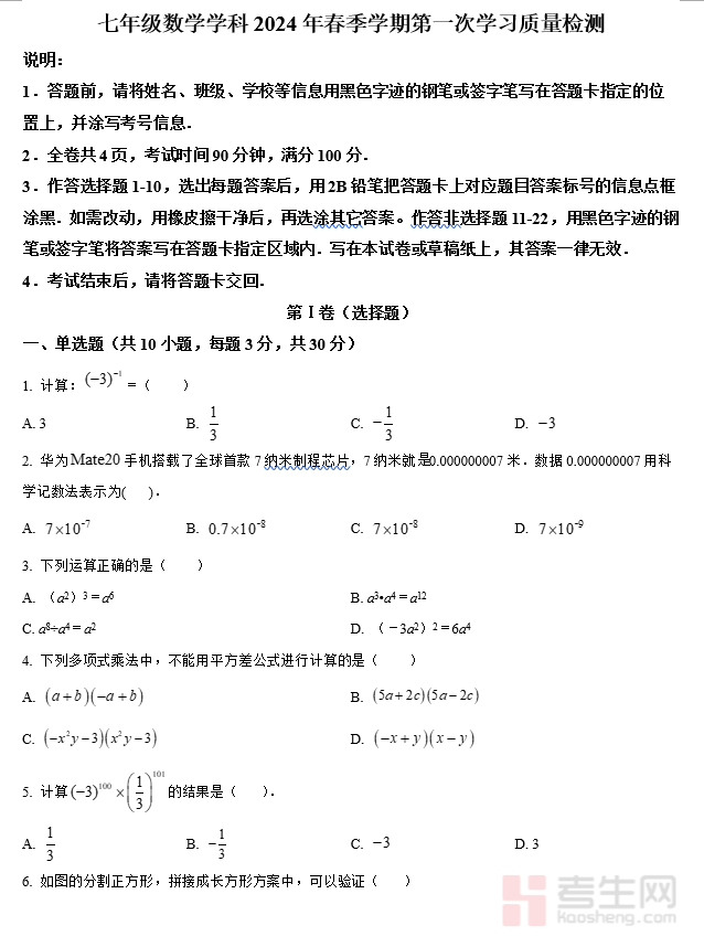 这是深圳市龙岗区横岗中心学校 2023-2024 学年七年级下学期月考数学试题,贴合深圳本地教学进度,聚焦七年级下册核心知识点。试卷题型规范、结构合理,注重基础巩固与简单应用考查,难度适中,贴合校内月考定位。能有效检测学生阶段性学习效果,适合同步练习、自测摸底、查漏补缺,是初一学生阶段性复习、巩固提升的实用真题资料。