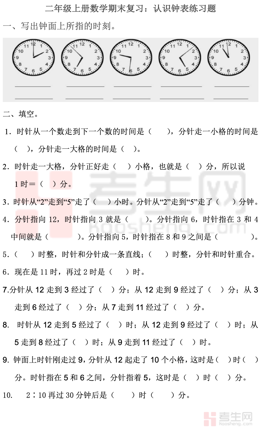 本文档为二(上)数学期末认识时间练习题,专为小学二年级上册学生期末复习设计,聚焦 “认识时间” 单元重点知识。题型包含认读钟面、几时几分、时间单位换算、经过时间计算、时间排序等,贴合教材与期末考点,难度适中、针对性强。题目由浅入深,兼顾基础巩固与能力提升,帮助学生熟练掌握看钟表、算时间的方法,强化时间观念与数学应用能力。题量适中、排版清晰,适合课堂练习、期末专项复习、家庭作业使用,能有效查漏补缺,提升解题正确率,是二年级上册数学期末复习中认识时间模块的实用专项练习资料。
