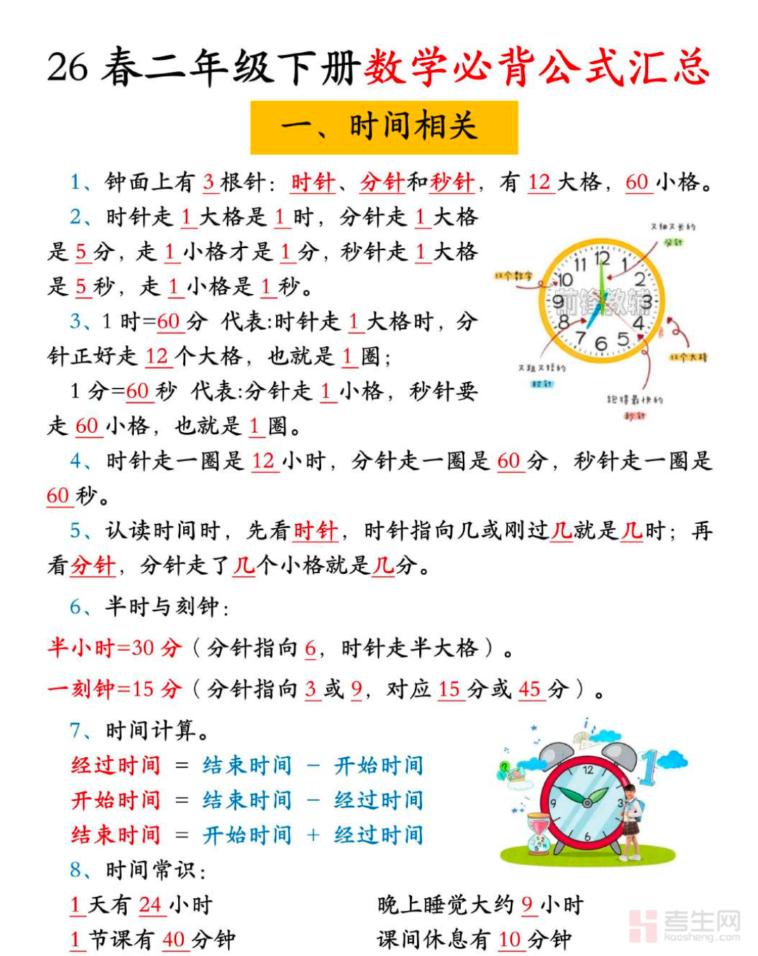 本文档为 26 春二年级下册数学必背公式汇总(时间相关),专为小学二年级下册学生整理,聚焦时间单元核心知识点。内容包含时间单位换算、钟面认识、经过时间计算等必背公式与关键结论,条理清晰、重点突出,方便学生快速记忆、熟练掌握。内容紧扣教材,语言简洁易懂,适合低年级孩子理解与背诵,可用于课前预习、课堂复习、单元巩固及考前查漏补缺。排版整齐、一目了然,便于打印张贴、随时查看记忆,帮助孩子夯实时间相关数学基础,提升解题速度与准确率,是二年级下册数学时间模块高效复习的必备资料。