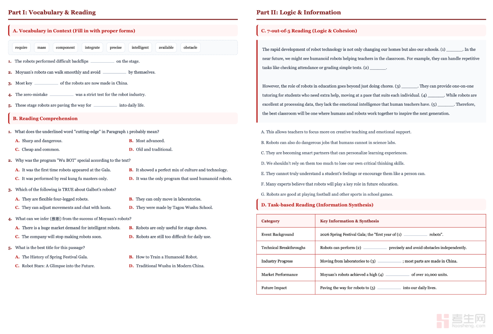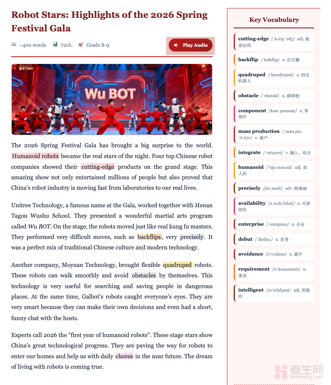 本文档为【英语阅读】春晚机器人表演,是结合马年春晚热点打造的少儿英语阅读素材。内容围绕春晚机器人表演展开,以简洁地道的英文呈现机器人跳舞、武术表演、人机互动等精彩场景,词汇贴近小学英语水平,句式简单易懂,适合孩子阅读与跟读。素材兼具时效性与趣味性,把节日热点和英语学习结合,既能帮助孩子积累科技、节日相关词汇,提升阅读理解能力,又能感受中国科技与传统文化的魅力。文章长度适中、排版清晰,可用于课堂阅读、课后练习、口语拓展,是孩子轻松学英语、了解春晚科技亮点的实用阅读资料。
