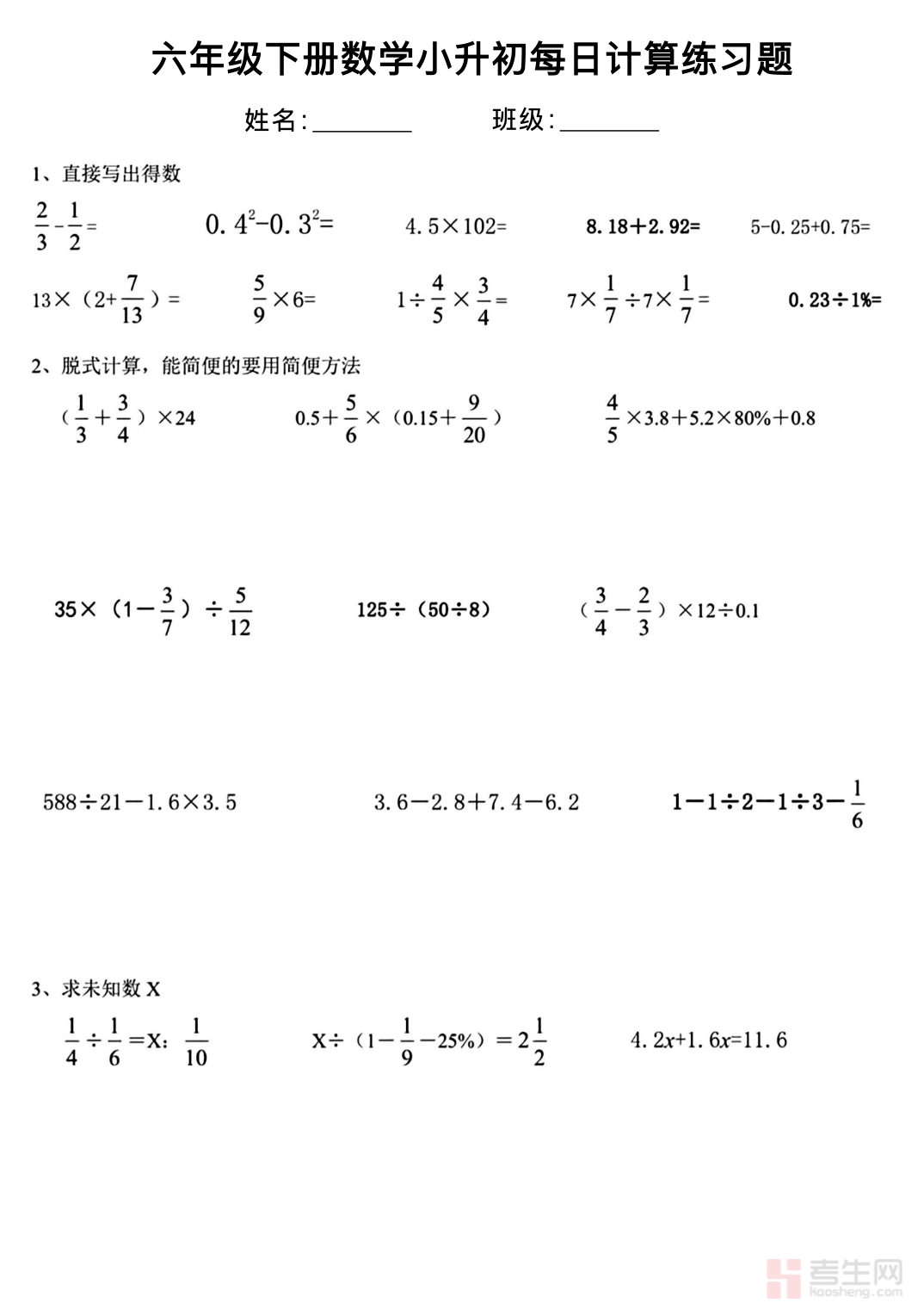 本文档为六年级下册数学小升初每日计算练习,专为小升初阶段学生设计,同步六年级下册数学知识点,贴合小升初计算考点。练习包含口算、竖式计算、脱式简便运算、解方程、解比例等常见题型,难度循序渐进,题量适中,适合每日坚持练习。内容聚焦基础运算与易错题型,帮助学生巩固计算能力,提高运算速度与正确率,培养良好做题习惯。每日一练,轻松提升计算基本功,为小升初数学考试打下扎实基础。排版清晰、方便打印,适合课后巩固、居家练习、考前冲刺使用,是小升初数学备考中高效提升计算水平的实用每日练习资料。