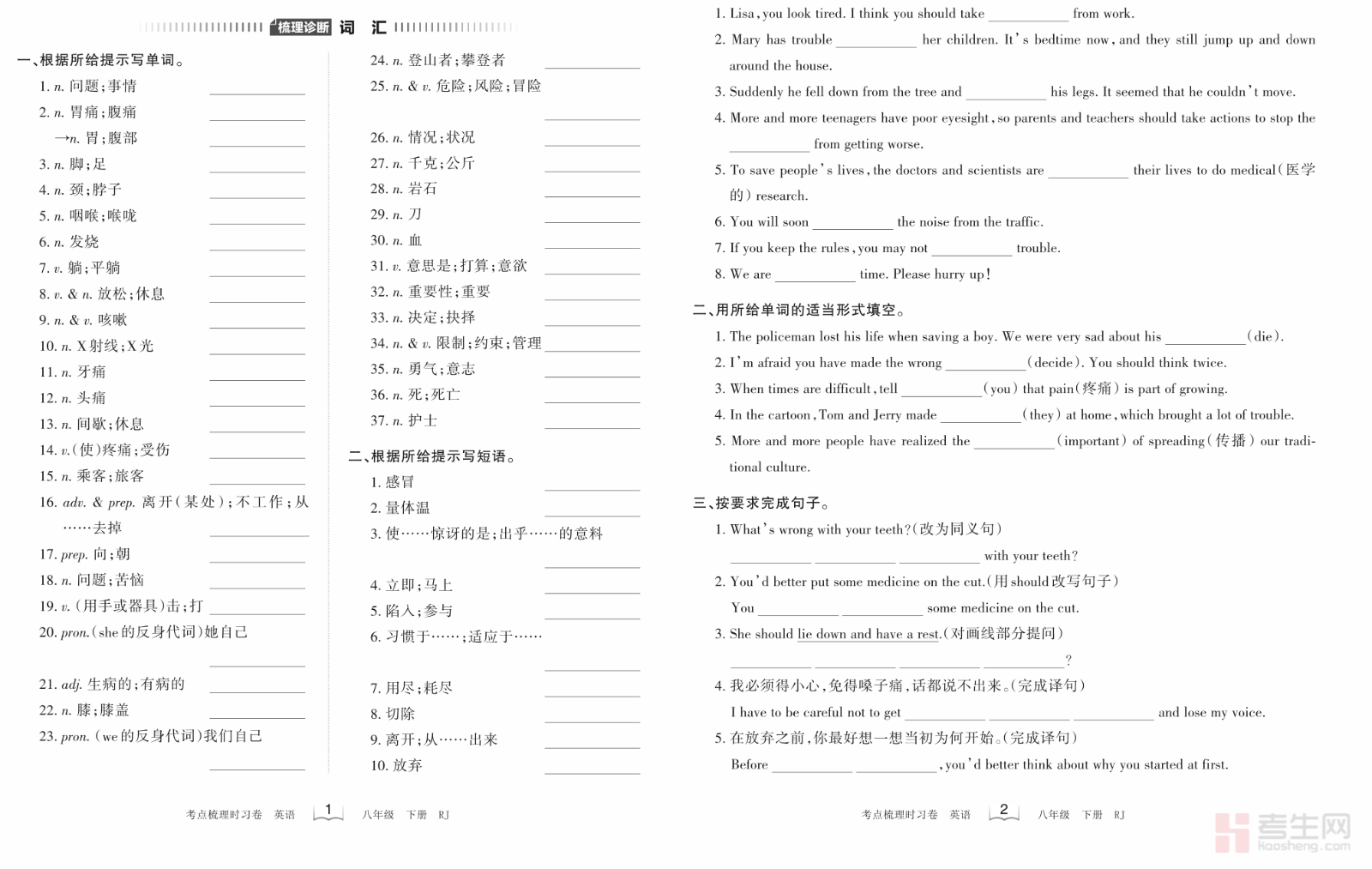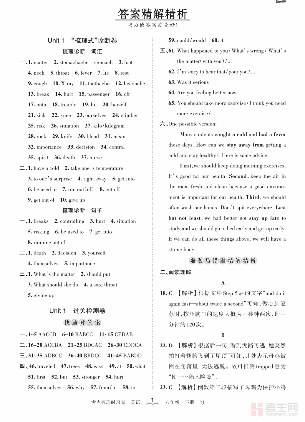 本文档为王朝霞 单元活页卷 英语 人教版 八年级下册(含答案解析),同步人教版八年级下册英语教材内容,贴合初中英语单元检测与期中期末复习需求。试卷采用活页设计,便于拆分练习、随堂测试与整理归档。题型全面,涵盖词汇、语法、句型、完形填空、阅读理解、书面表达等常考内容,难度循序渐进,紧扣教材重点与考点。每套试卷均配有详细答案解析,讲解清晰,方便学生自主核对、查漏补缺,巩固语言知识、提升解题能力。适用于单元自测、课后巩固、期中期末复习及考前模拟,是八年级下册英语夯实基础、提高应试水平的实用试卷资料。
