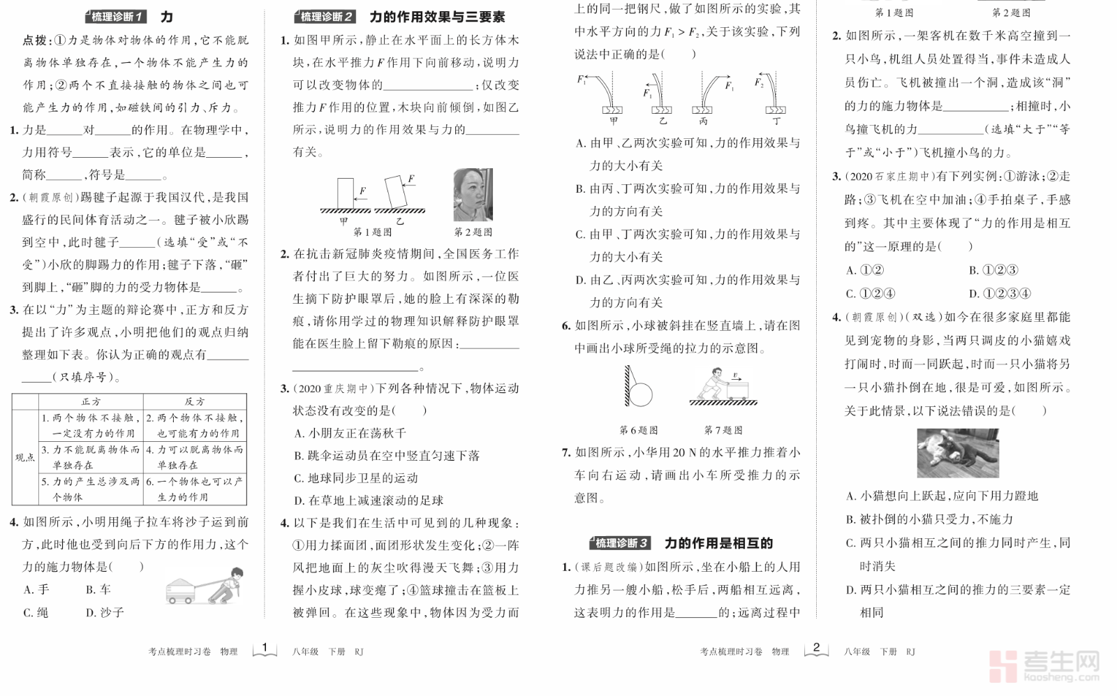 本文档为王朝霞 单元活页卷 物理 人教版 八年级下册(含答案解析),同步人教版八年级下册物理教材内容,贴合初中物理单元检测与期中期末复习要求。试卷采用活页设计,便于拆分练习、随堂检测与整理保存。题型全面,涵盖选择题、填空题、作图题、实验探究题、计算题等常考题型,紧扣力学、压强、浮力等核心知识点,难度适中,重点突出,贴合课堂教学与考试方向。每套试卷均配有详细答案解析,思路清晰,方便学生自主核对、查漏补缺,巩固知识、规范解题步骤。适用于单元自测、课后巩固、期中期末复习及考前模拟,是八年级下册物理夯实基础、提升应试能力的实用试卷资料。