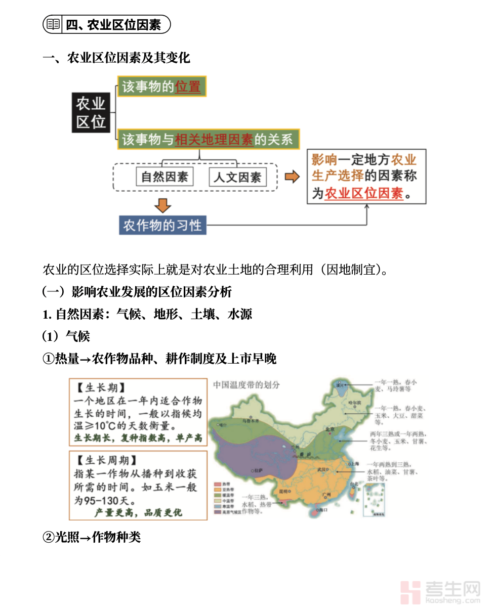 高中地理知识点专项总结:农业区位因素,聚焦高中地理核心考点,系统梳理影响农业生产与布局的各类区位因素。内容包含自然区位(气候、地形、土壤、水源)与社会经济区位(市场、交通、政策、科技、劳动力、工业基础)两大板块,对各要素的作用、典型案例与常考图表进行归纳整理。资料重点突出、条理清晰,结合考试高频题型,便于理解记忆与答题运用。适合高中学生巩固知识点、强化专题训练、提升地理分析能力,为学业水平考试与高考复习提供实用、精准的专项学习参考。