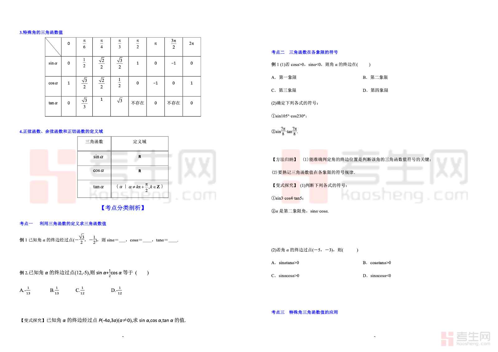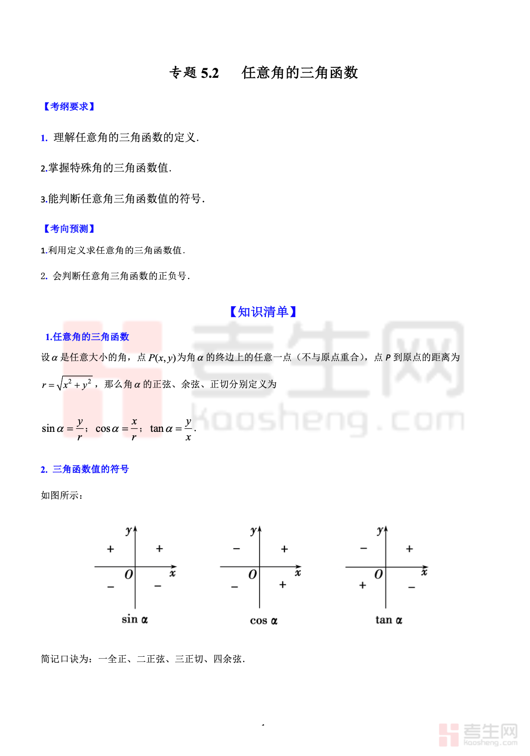 5.2 任意角的三角函数 高考数学一轮艺体生基础复习讲义(新高考),专为艺术、体育类考生一轮基础复习打造,紧扣新高考考纲与基础考点。内容系统讲解任意角三角函数的定义、同角三角函数基本关系、三角函数值符号判断、特殊角三角函数值等核心内容。讲义语言通俗、重点突出,侧重基础理解与简单运算,避开复杂推导,搭配典型例题与基础习题,帮助艺体生快速掌握核心知识、夯实基础。适合艺体生一轮系统复习使用,助力稳步提升数学基础得分,高效备战新高考。
