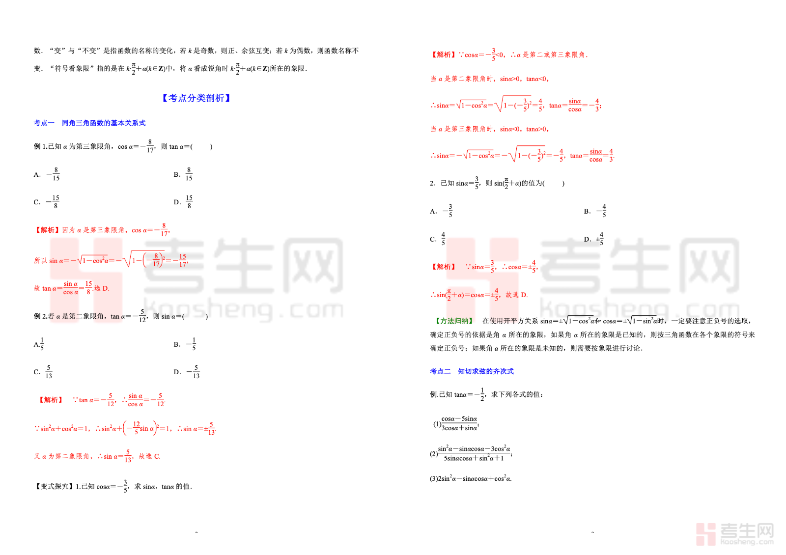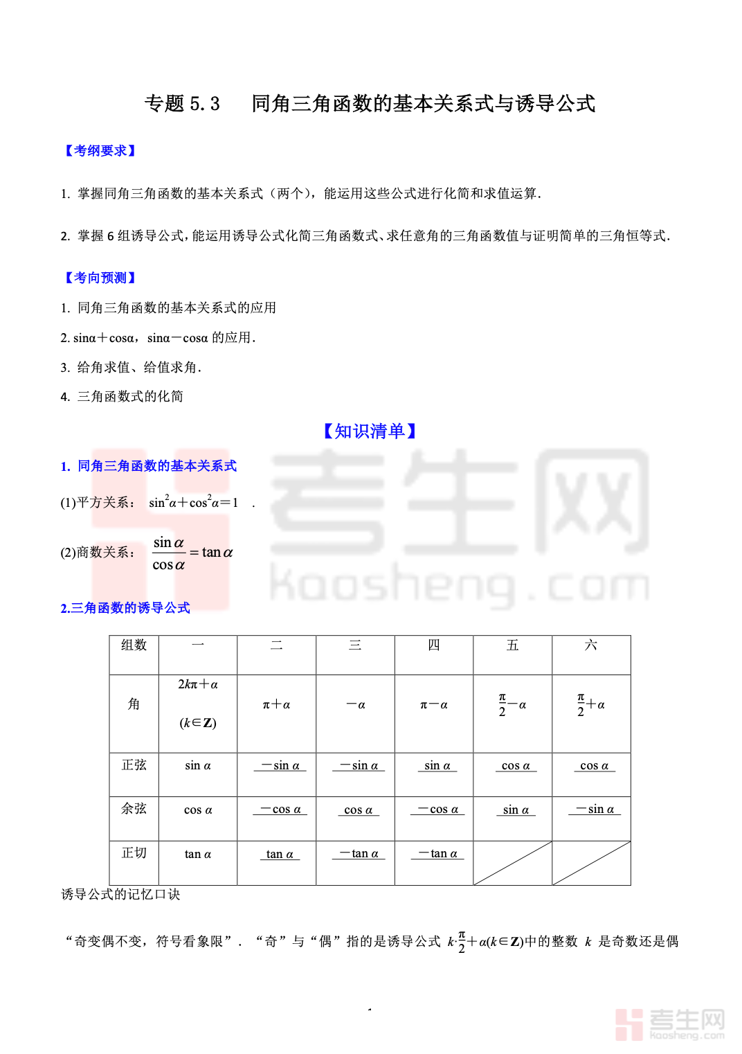 5.3 同角三角函数的基本关系式与诱导公式 高考数学一轮艺体生基础复习讲义(新高考),针对艺术、体育类考生基础薄弱、重基础得分的复习特点编写,紧扣新高考基础考点。内容系统梳理同角三角函数平方关系、商数关系,以及各类诱导公式的记忆规律与化简计算方法,侧重公式理解、快速记忆和基础运算。讲义讲解直白、步骤清晰,避开复杂技巧,突出高频基础题型与易错点提醒,配套例题与基础练习。适合艺体生一轮复习夯实三角函数计算基础,提升解题准确率,助力高效备考、稳拿基础分。