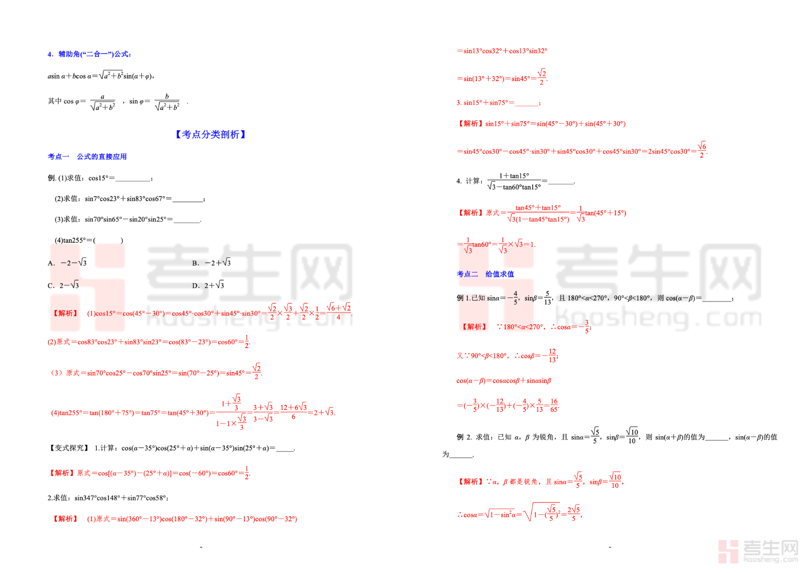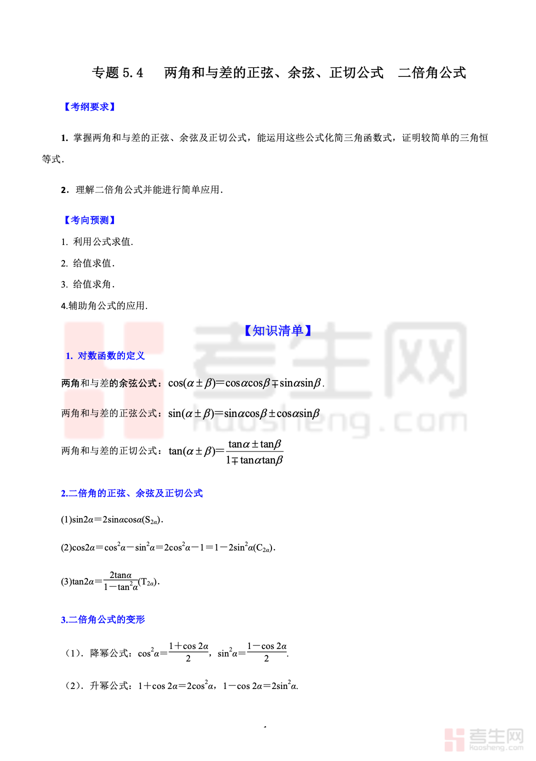 5.4 两角和与差的正弦、余弦、正切公式 高考数学一轮艺体生基础复习讲义(新高考),专为艺术、体育类考生一轮基础复习设计,贴合新高考基础命题方向。内容系统梳理两角和与差的正弦、余弦、正切公式,重点讲解公式结构、记忆方法与基础应用。讲义以基础计算、简单化简求值为主,讲解通俗易懂、步骤详细,避开复杂变形与难题,搭配典型例题和基础练习题,帮助艺体生快速掌握核心公式、夯实三角运算基础。适合艺体生巩固知识点、提升基础得分能力,高效备战高考数学。