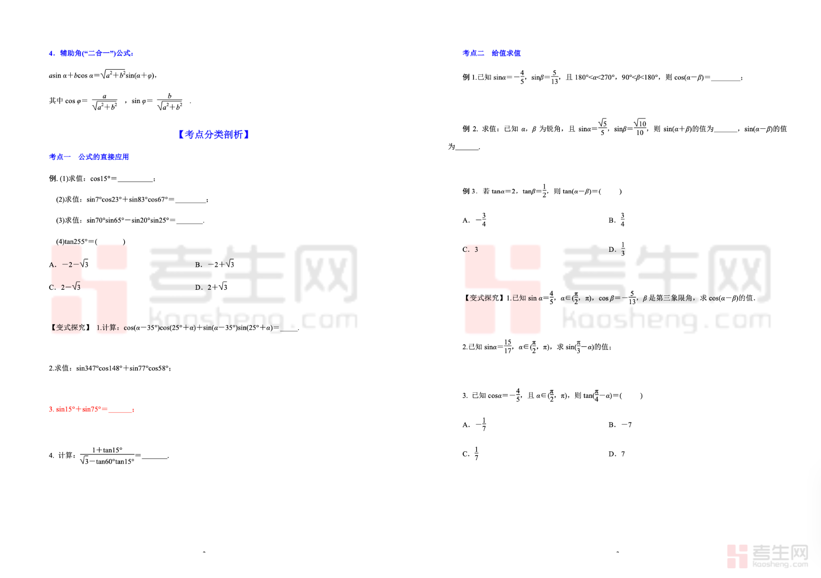 5.4 两角和与差的正弦、余弦、正切公式 高考数学一轮艺体生基础复习讲义(新高考),专为艺术、体育类考生一轮基础复习设计,贴合新高考基础命题方向。内容系统梳理两角和与差的正弦、余弦、正切公式,重点讲解公式结构、记忆方法与基础应用。讲义以基础计算、简单化简求值为主,讲解通俗易懂、步骤详细,避开复杂变形与难题,搭配典型例题和基础练习题,帮助艺体生快速掌握核心公式、夯实三角运算基础。适合艺体生巩固知识点、提升基础得分能力,高效备战高考数学。