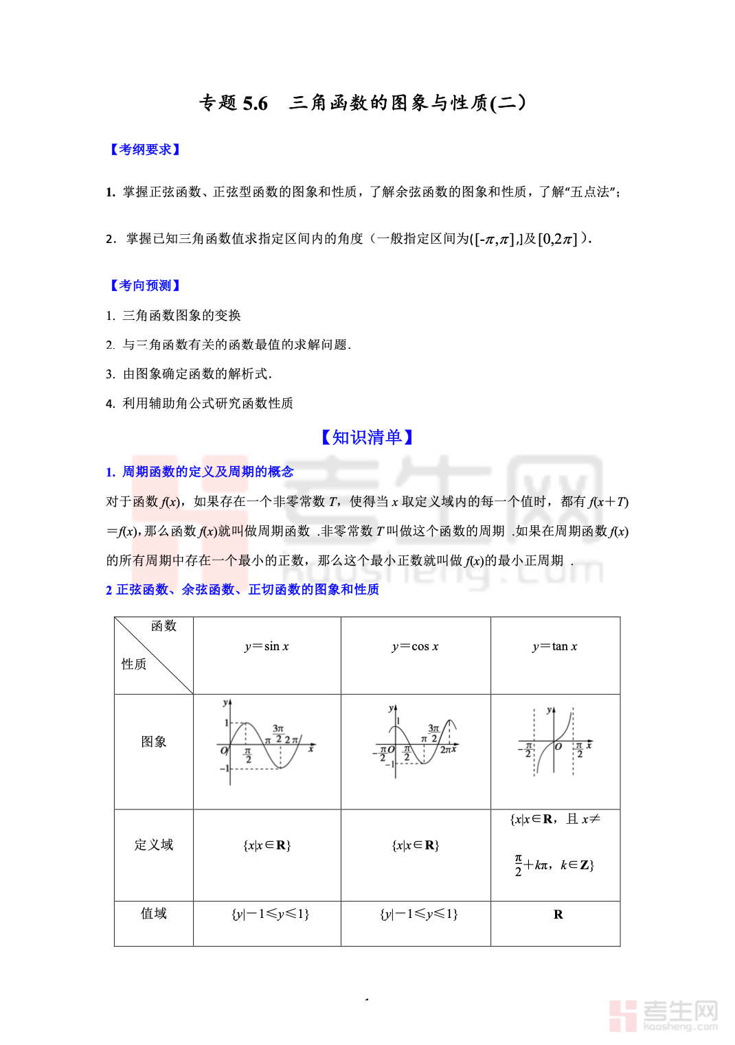 5.6 三角函数的图象与性质(二)高考数学一轮艺体生基础复习讲义(新高考),面向艺术、体育类考生基础复习打造,紧扣新高考基础考点。内容重点讲解正弦函数、余弦函数的图像、定义域、值域、周期性、奇偶性、单调性等核心性质,侧重图像识别、基础性质判断与简单计算。讲义讲解通俗、重点明确,避开复杂推导与难题,突出基础题型和解题步骤,搭配典型例题与基础练习。适合艺体生一轮夯实三角函数图像与性质基础,快速掌握得分点,提升解题正确率,高效备战高考数学。
