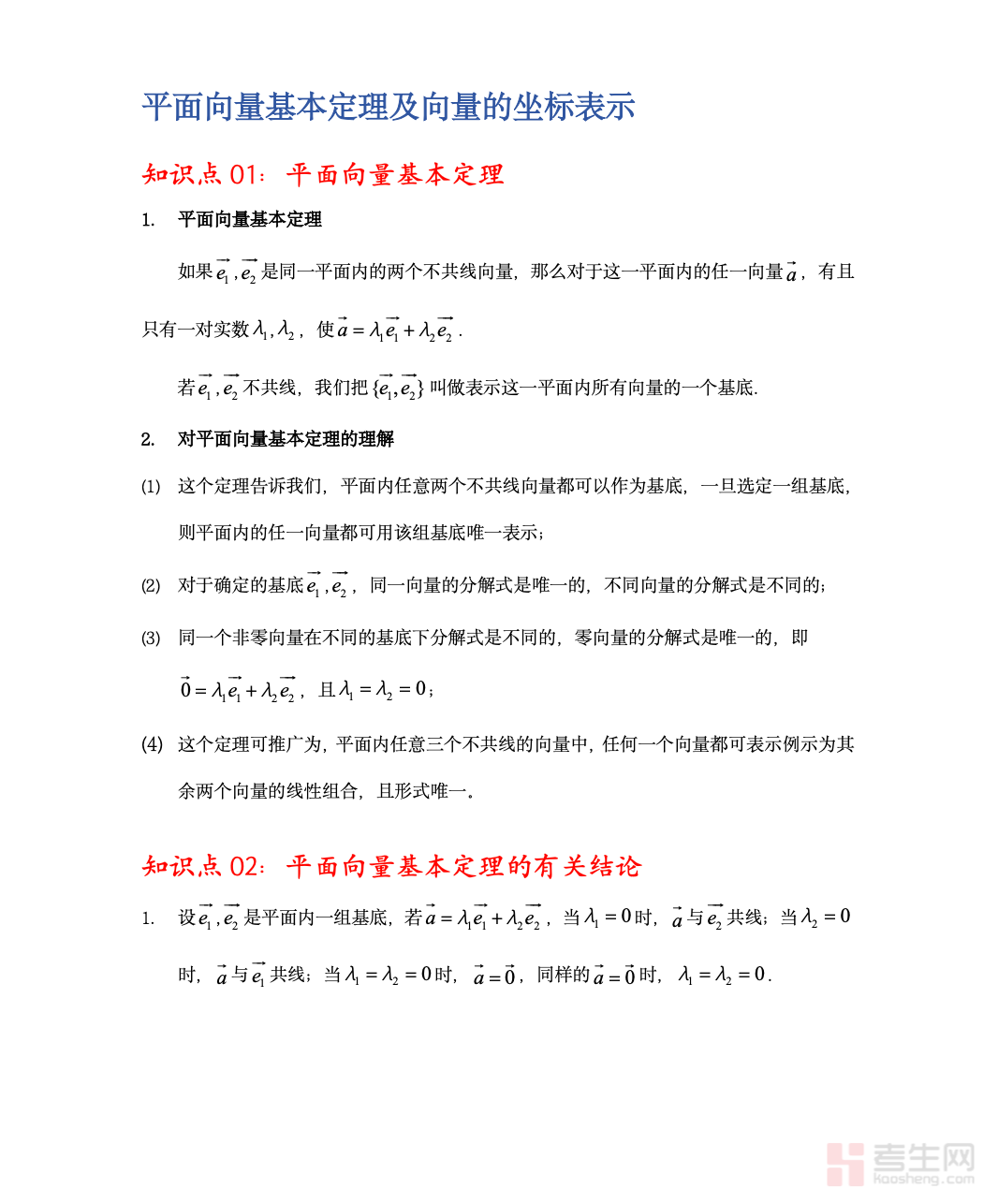 高中数学专题 —— 平面向量基本定理及向量的坐标表示,围绕平面向量核心知识点展开系统讲解与练习。内容涵盖平面向量基本定理的理解与应用、向量的坐标表示、坐标运算、共线向量的坐标判定等高频考点,紧扣高中数学教材与考试要求。资料对重点公式、解题思路和易错点进行清晰梳理,搭配典型例题,帮助学生熟练掌握向量的代数化运算方法,提升用坐标解决几何问题的能力。内容由浅入深、实用性强,适合新课学习、单元巩固及高三基础复习使用,助力学生夯实向量基础,提高解题效率与正确率。