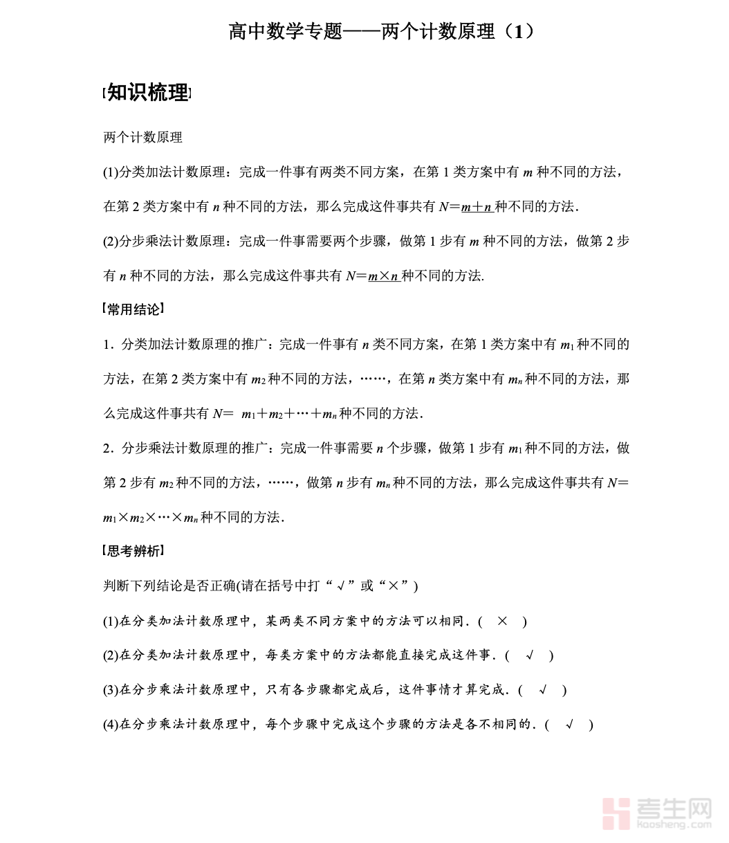 高中数学专题 —— 两个计数原理,针对高中数学排列组合基础模块系统讲解,重点梳理分类加法计数原理与分步乘法计数原理的核心概念、适用条件与解题思路。内容结合典型例题,帮助学生区分 “分类” 与 “分步”,掌握基础计数方法,为后续排列组合学习打好根基。专题紧扣高考考点,对常见题型、易错点、解题步骤进行归纳,注重逻辑思维与实际应用能力培养。内容由浅入深、条理清晰、实用性强,适合新课学习、单元巩固及高三基础复习使用,助力学生扎实掌握计数原理,提升概率统计模块解题能力。