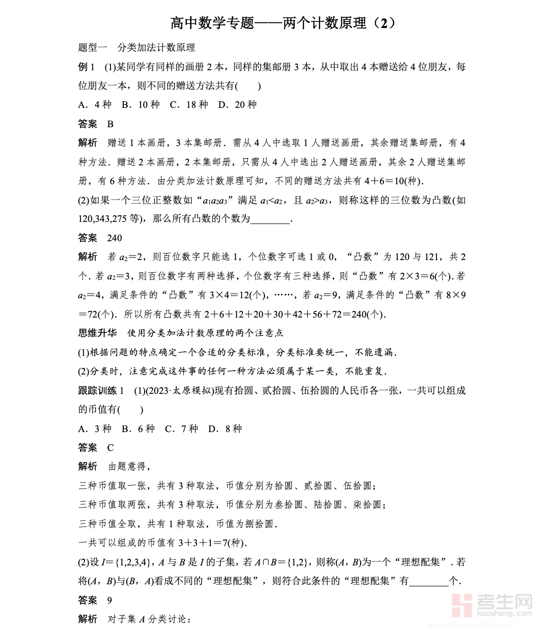 高中数学专题 —— 两个计数原理,针对高中数学排列组合基础模块系统讲解,重点梳理分类加法计数原理与分步乘法计数原理的核心概念、适用条件与解题思路。内容结合典型例题,帮助学生区分 “分类” 与 “分步”,掌握基础计数方法,为后续排列组合学习打好根基。专题紧扣高考考点,对常见题型、易错点、解题步骤进行归纳,注重逻辑思维与实际应用能力培养。内容由浅入深、条理清晰、实用性强,适合新课学习、单元巩固及高三基础复习使用,助力学生扎实掌握计数原理,提升概率统计模块解题能力。