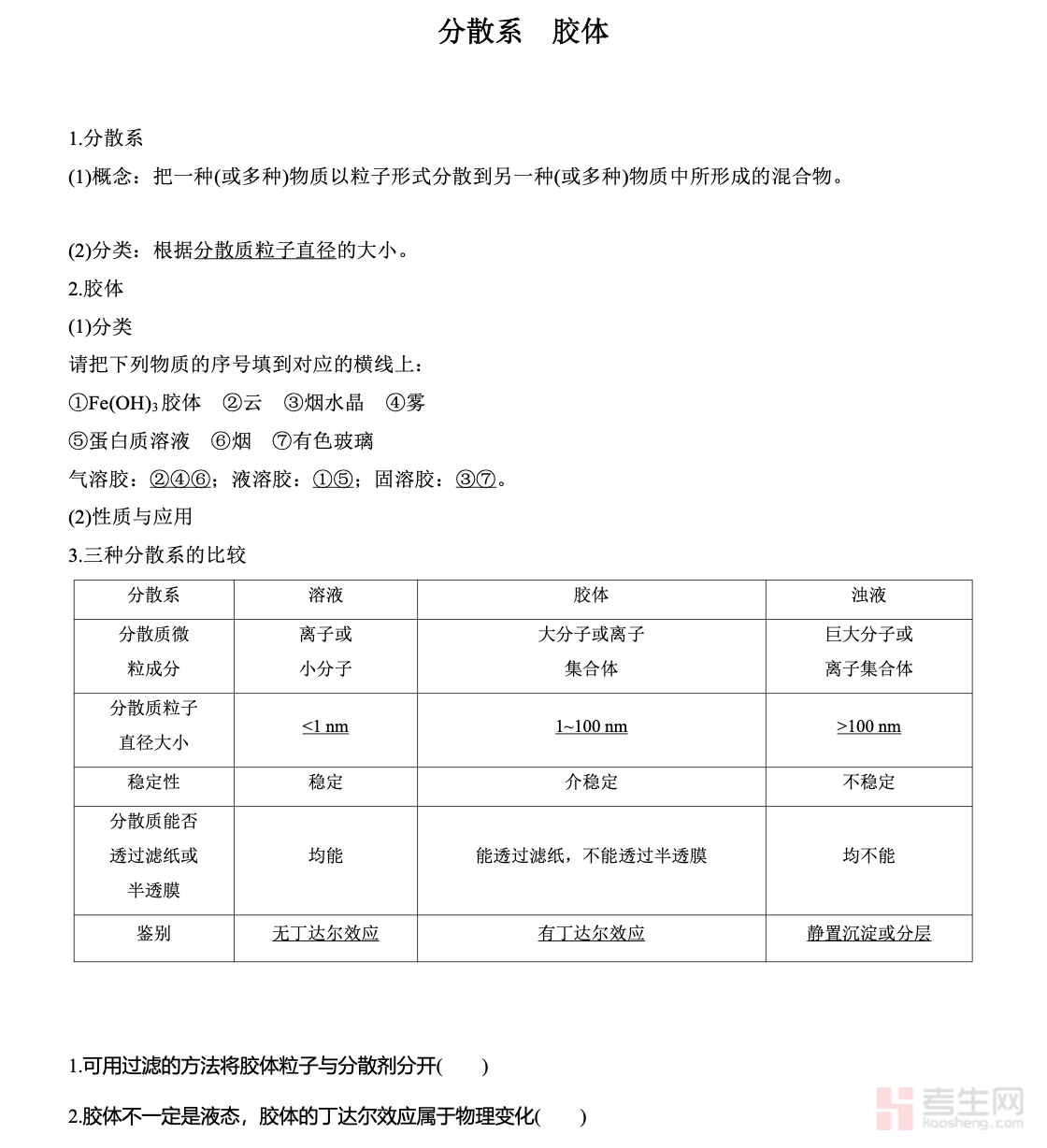 高中化学专题 —— 分散系 胶体,围绕高中化学核心知识点展开,系统讲解分散系的概念、分类及三种分散系(溶液、胶体、浊液)的本质区别与性质对比。专题重点解析胶体的定义、分散质粒子直径范围、丁达尔效应、电泳、聚沉等关键性质,梳理常见胶体实例与应用。内容紧扣教材与高考考纲,结合典型例题强化概念辨析、性质判断与应用题解题思路,明确易错点与考点方向。知识点条理清晰、重点突出,适合新课学习、课堂笔记整理与一轮复习使用,帮助学生快速掌握分散系与胶体核心内容,夯实化学基础,提升解题准确率。