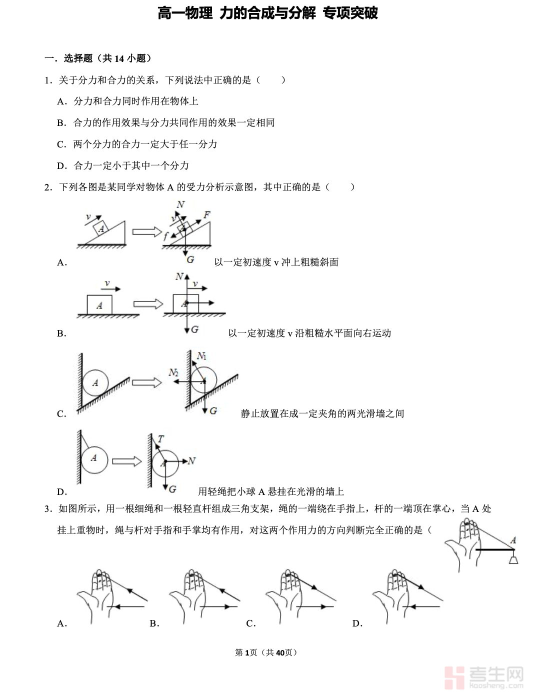 本专项紧扣高一物理必修一核心考点,聚焦力的合成与分解的核心方法与高频易错点,系统讲解平行四边形定则、三角形定则及正交分解法的应用逻辑。内容重点突破合力范围判断、按实际效果分解、三角函数应用错误、矢量方向判定等关键问题,通过典型例题分层剖析解题思路,配套针对性变式训练强化方法迁移。专题结构清晰、针对性极强,适配课堂同步巩固、单元专项攻关与考前方法复盘,帮助学生建立规范的矢量分析思维,熟练掌握多力平衡与动态受力的解题技巧,扎实筑牢相互作用模块的学习基础。