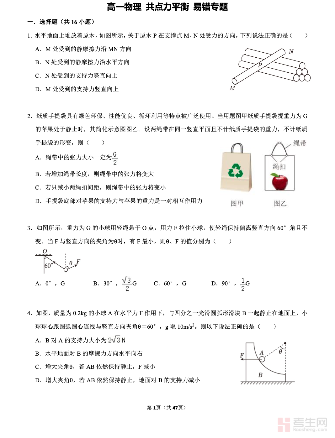 本专题紧扣高一物理必修一核心考点,聚焦共点力平衡的解题误区与关键难点,系统梳理平衡条件的应用逻辑。内容精准锁定高频易错点,包括整体法与隔离法混用、受力分析漏力或多力、轻绳轻杆模型混淆、临界状态判断失误及正交分解坐标系选择不当等。通过典型错题深度剖析错误成因,配套针对性解题策略与变式训练,强化规范分析思路。专题结构清晰、实用性强,适配课堂同步纠错、单元专项突破与考前易错点复盘,帮助学生避开思维陷阱,熟练掌握共点力平衡的核心方法,筑牢力学基础。