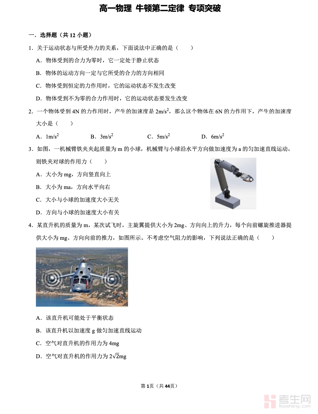 本专项紧扣高一物理必修一核心,聚焦牛顿第二定律的四大核心特性与综合应用,系统拆解 F 合 = ma 的解题逻辑。内容重点突破矢量性、瞬时性、同体性、独立性的理解误区,以及整体法与隔离法的灵活选用、正交分解坐标系的合理建立、摩擦力方向判断等高频难点。通过典型例题分层剖析解题步骤,配套针对性变式训练强化方法迁移,明确公式适用条件与易错点。专题结构清晰、实用性强,适配课堂同步巩固、单元专项攻关与考前方法复盘,帮助学生建立力与运动的关联思维,扎实掌握动力学核心解题技巧。
