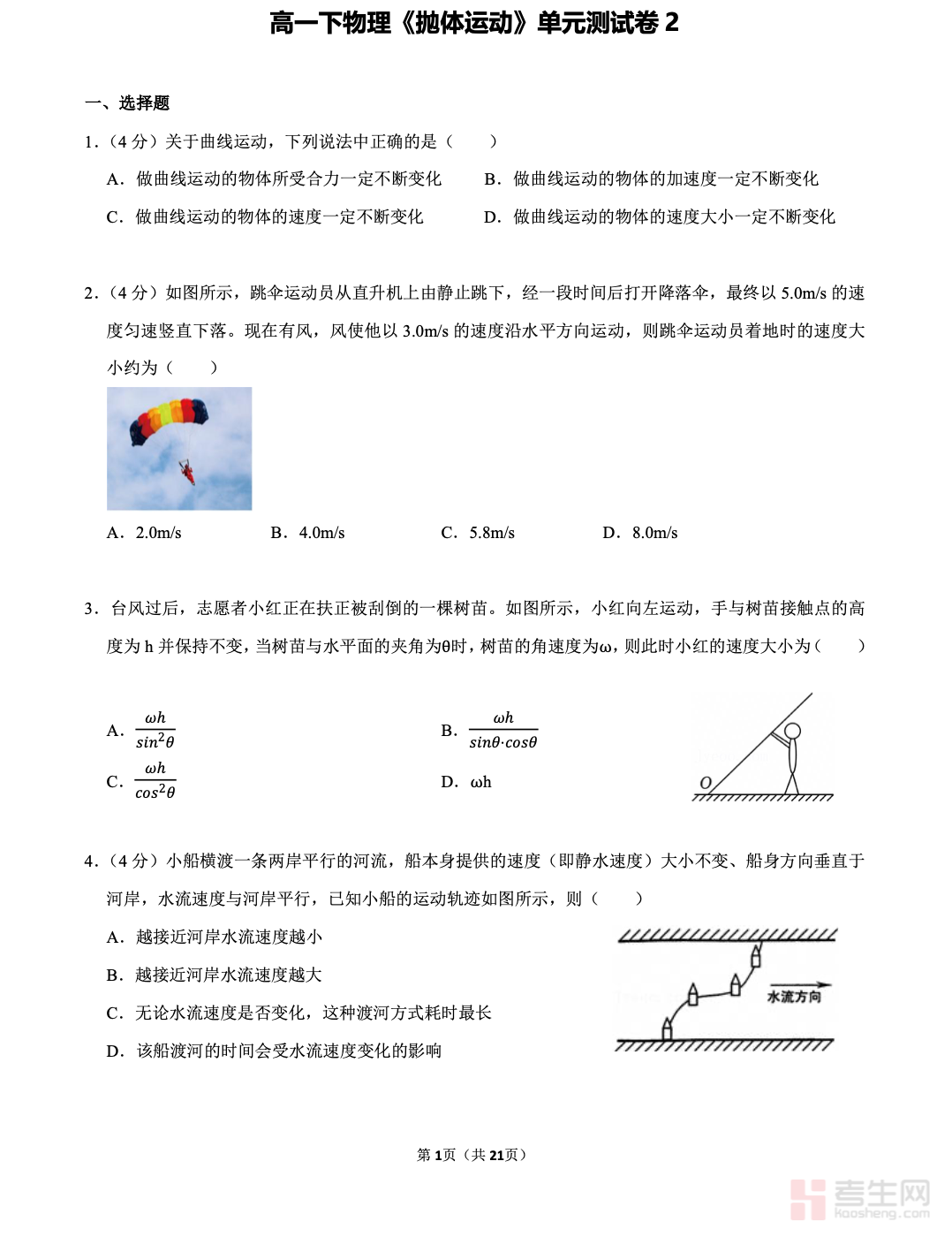 本文档是适配高一下物理《抛体运动》单元的专项测试卷,严格依据人教版教材重难点与课程标准编写,全面覆盖曲线运动条件、运动的合成与分解、平抛运动规律、斜抛运动基本分析等核心考点。试卷题型丰富,包含选择题、填空题、实验题、计算题,难度梯度合理,注重基础理解与规律应用,贴合课堂练习与单元测评要求。题目紧扣高频考法,侧重过程分析与公式应用,可用于学生自主检测、查漏补缺,也可作为教师单元验收、学情反馈使用。帮助学生巩固抛体运动解题思路,提升运动分解与计算能力,是高一下物理抛体运动单元复习与检测的实用资料。