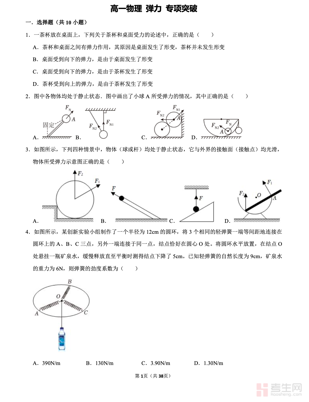 本专项紧扣高一物理必修一核心,聚焦弹力的产生条件、方向判定与定量计算三大关键,系统拆解胡克定律与常见弹力模型的应用逻辑。内容精准突破接触无挤压判断、轻绳轻杆模型混淆、胡克定律形变量误区及瞬时性问题等高频易错点,通过典型例题分层剖析解题思路,配套针对性变式训练强化方法迁移。专题结构清晰、实用性强,适配课堂同步巩固、单元专项攻关与考前方法复盘,帮助学生建立规范的弹力分析思维,扎实筑牢力学基础。