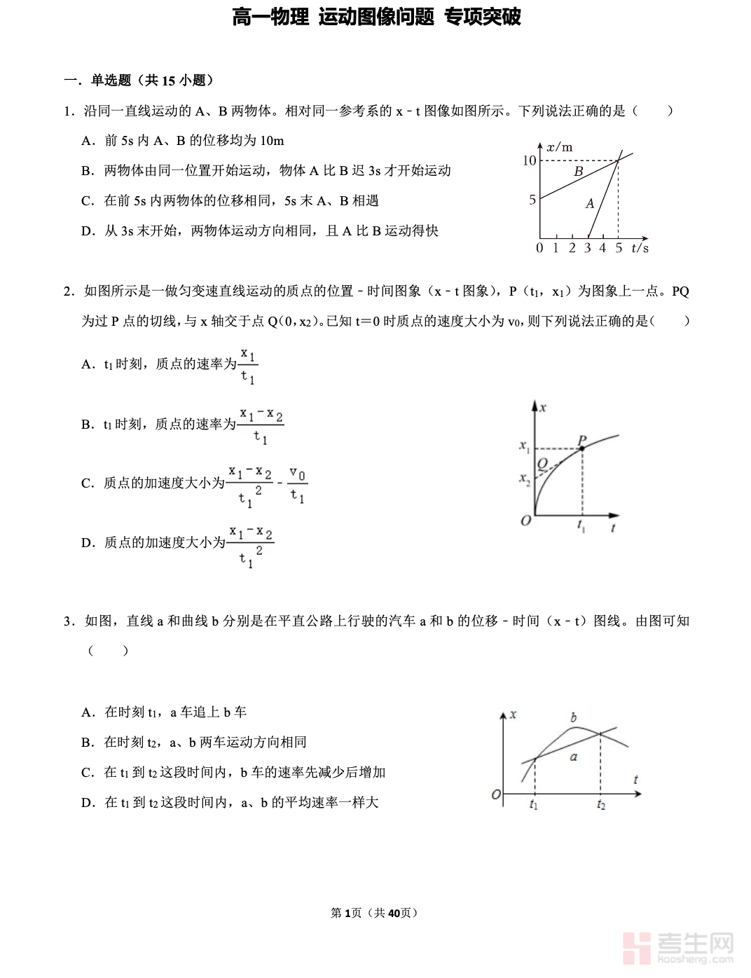 本专项针对高一物理运动图像高频考点展开系统讲解,重点围绕 x‑t 图像与 v‑t 图像的识别、斜率与面积含义、运动状态判断等核心内容展开。资料详细区分两类图像的易错点,帮助学生理清图像与实际运动的对应关系,掌握从图像中提取速度、加速度、位移等关键信息的方法。通过典型例题与解题步骤示范,强化图像分析能力,有效解决图像混淆、计算失误等问题。内容贴合教材与考试要求,结构清晰、实用性强,适合课堂巩固、单元复习和考前专项训练,助力学生熟练掌握图像解题思路,提升运动学综合解题能力。