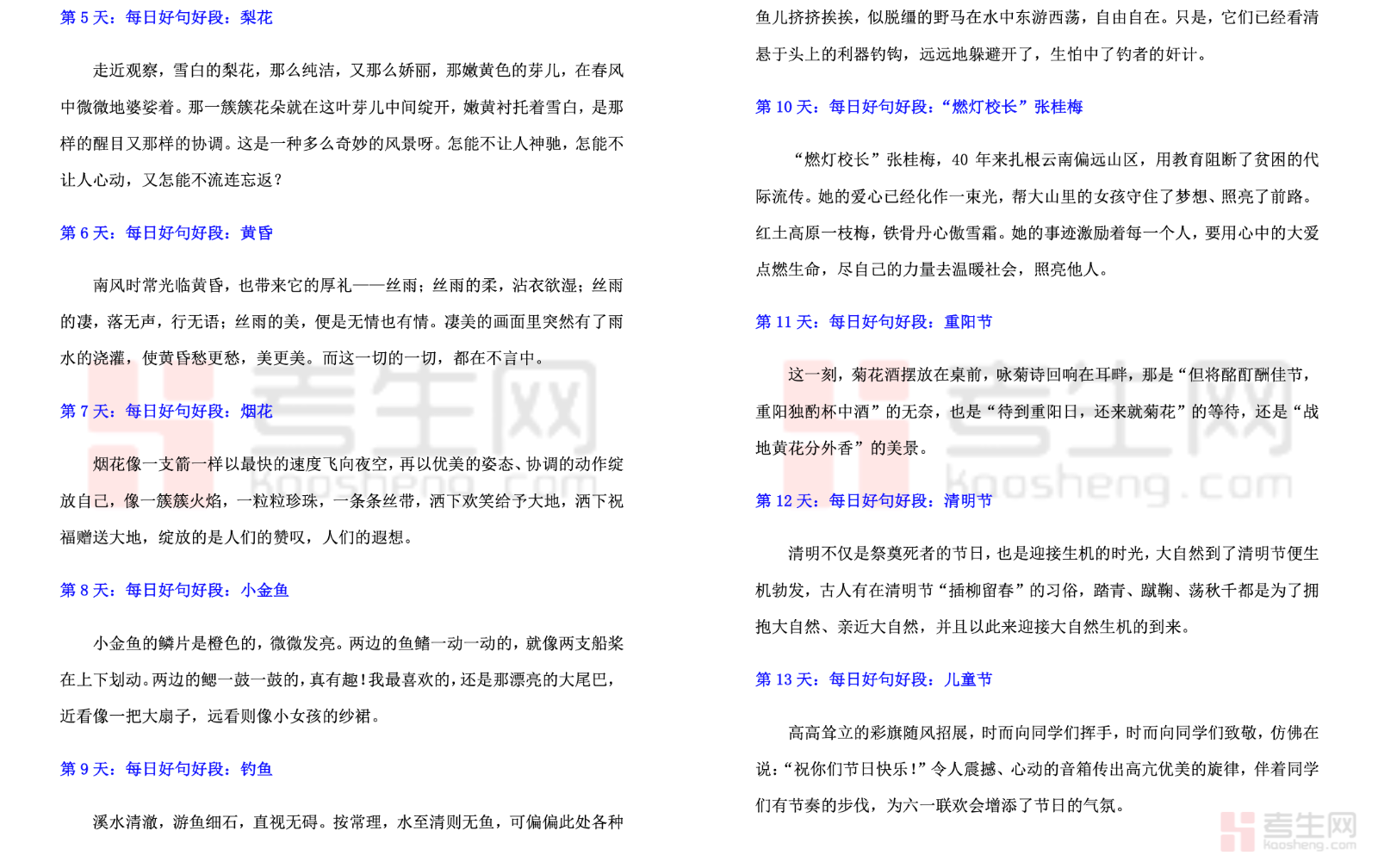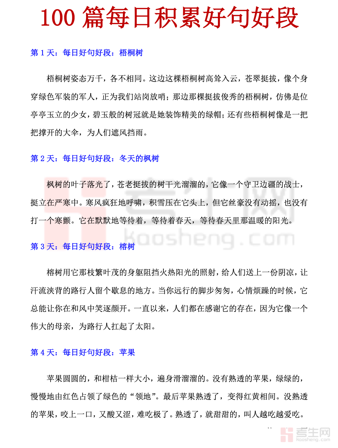 本资料汇集 100 篇适合日常积累的好句好段,内容涵盖写景、抒情、叙事、人物描写、哲理感悟等多个类别,语言优美、表达规范,适合中小学生及初高中学生用于作文提升、晨读背诵和语言积累。素材贴近日常写作与考试常用主题,句式多样、文采突出,既能丰富文字表达,又能培养语感和审美。每天积累一段,长期坚持可有效提升文笔,让写作更流畅、更有感染力。内容简洁实用,方便随时阅读和记忆,是日常学习中提升语文素养的优质素材。