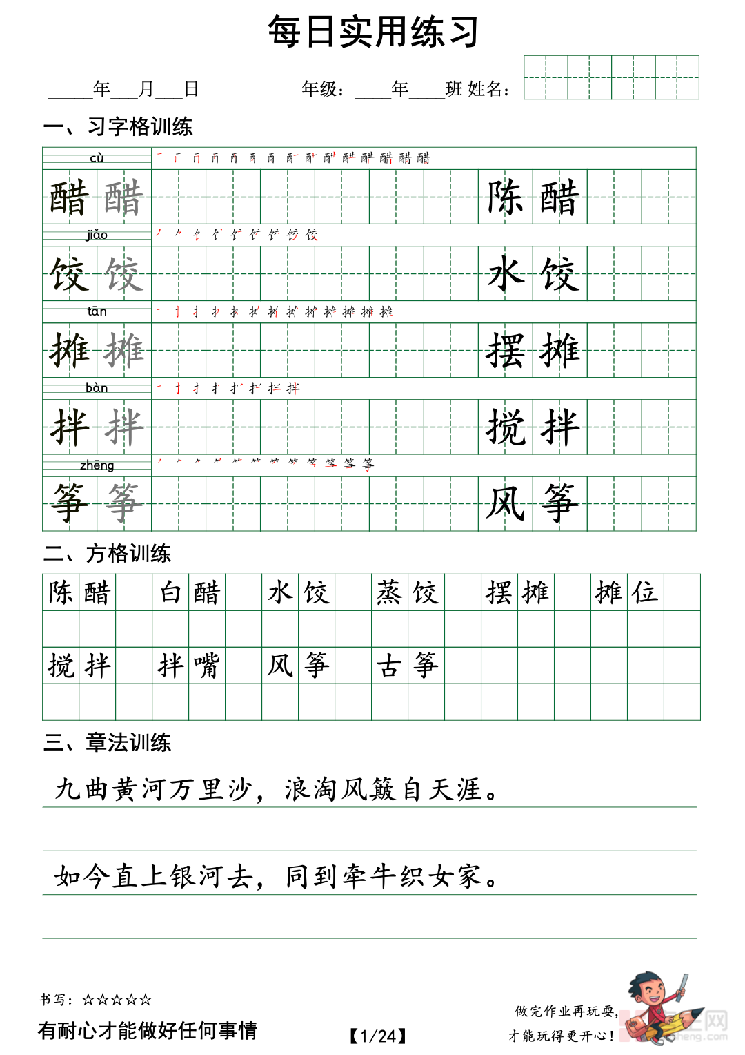 本资料专为六年级(下)语文设计,是贴合课堂同步的每日实用练习。内容紧扣部编版教材重难点,覆盖字词积累、句子运用、阅读理解、片段习作、古诗文默写等基础题型,按每日一练合理编排,题量适中、难度梯度平缓。练习注重实用性与基础性,强化课本知识巩固,兼顾小升初衔接需求,帮助学生养成每日积累、及时巩固的学习习惯。题型经典、题型全面,解析简洁易懂,适合课堂小练、课后巩固、家庭辅导使用。通过持续练习,夯实语文基础,提升阅读与表达能力,为六年级下学期学习与小升初备考打下扎实根基。