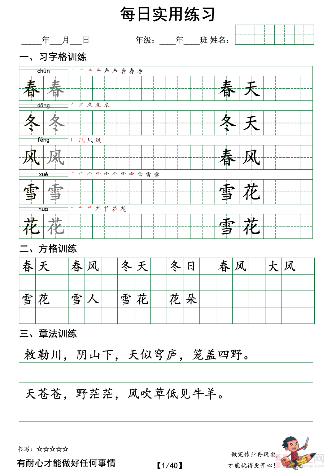 本资料专为一年级(下)语文设计,是同步部编版教材的每日实用练习。内容贴合低年级启蒙特点,围绕拼音巩固、生字认读、笔画笔顺、组词造句、简单词语搭配、课文背诵默写、看图说话起步等基础知识点展开,题型直观、题量适中、难度循序渐进,符合一年级学生学习节奏。练习注重趣味性与实用性,重点夯实识字、写字、朗读和表达基础,帮助孩子养成每日学习的好习惯。排版清晰、使用方便,适合课堂小练、课后巩固、家庭辅导及日常打卡使用,让孩子每天轻松练习、稳步提升,为一年级下学期语文学习打下扎实基础。