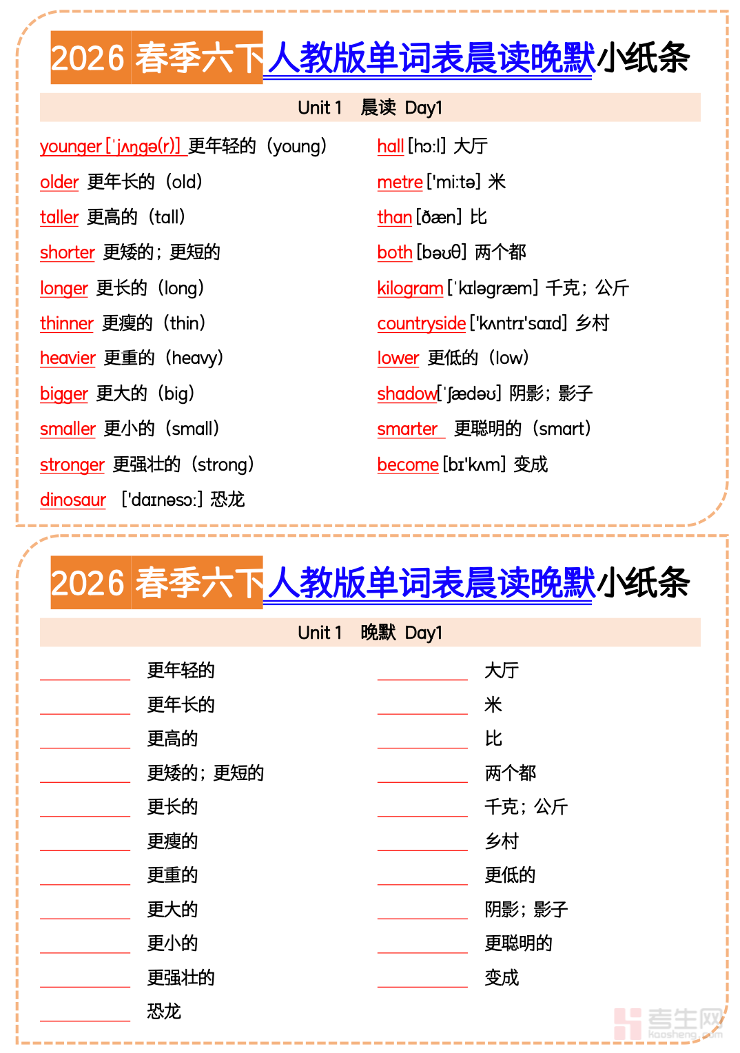 本资料为英语晨读晚默小纸条 人教版(六年级下),同步人教版教材单元编排,专为小学毕业班英语日常积累打造。内容涵盖重点单词、核心短语、经典句型、交际用语及单元必背句子,采用 “晨读 + 晚默” 模式,便于学生早晚高效记忆。内容精炼、重点突出,贴合小升初英语考查方向,帮助学生强化词汇积累、规范书写、提升语感。小纸条形式轻巧便携,可用于课前朗读、课后默写、早读背诵、考前速记。每日坚持使用,既能夯实英语基础,又能提升听说读写综合能力,为六年级下册英语学习与小升初备考提供高效、实用的随身学习工具。