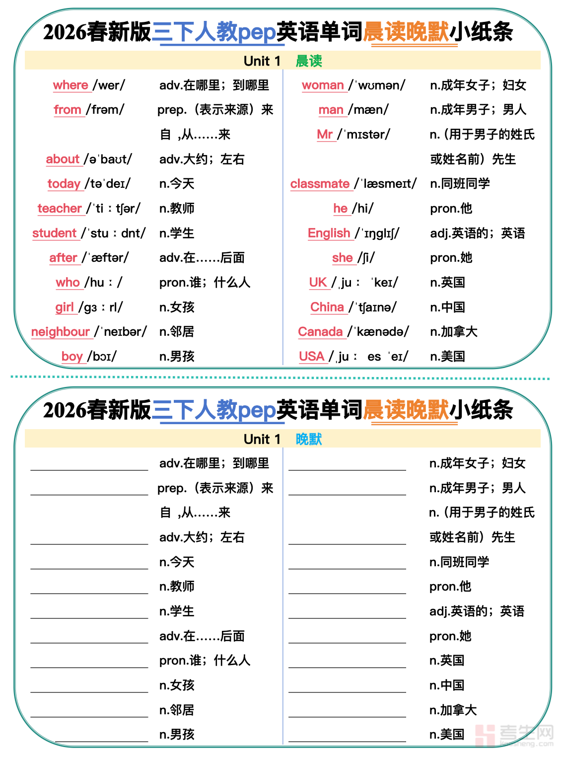本资料为英语晨读晚默小纸条 人教版(三年级下),专为刚接触英语的三年级学生量身打造,同步人教版教材单元重点。内容包含基础单词、常用短语、简单交际句型与重点句子,采用 “晨读 + 晚默” 模式,贴合低年级英语启蒙规律,帮助学生轻松记忆、规范书写。内容简洁、重点明确、排版清晰,小纸条轻巧便携,适合早读朗读、课后默写、课前预习、课堂复习及考前速记。每日坚持使用,既能夯实单词与句型基础,又能培养语感和学习习惯,提升口语与书写能力,为三年级下册英语学习提供简单、高效、易坚持的随身学习素材。