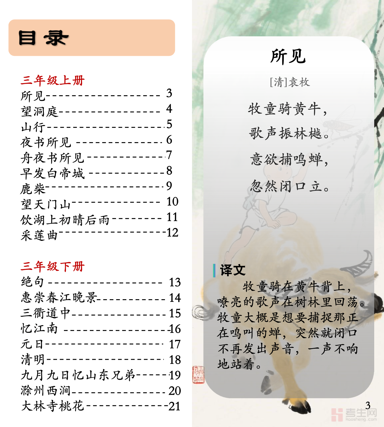 本资料为三年级古诗词汇总,依据部编版三年级语文教材全面整理,收录上下册必背经典诗词,覆盖山水田园、童真童趣、思乡咏物、节日习俗等常见主题,篇目齐全、编排有序,方便学生系统背诵与复习。每首诗词附原文、简要注释、译文与核心赏析,重点标注易错字、必背名句与常考考点,帮助学生理解诗意、感受韵律、积累文学素养。内容简洁易懂、重点突出,贴合三年级学习水平,适合课堂诵读、课后巩固、单元复习与考前速记,助力孩子夯实古诗文基础,提升语文积累与审美能力,为小学中段语文学习提供实用支持。
