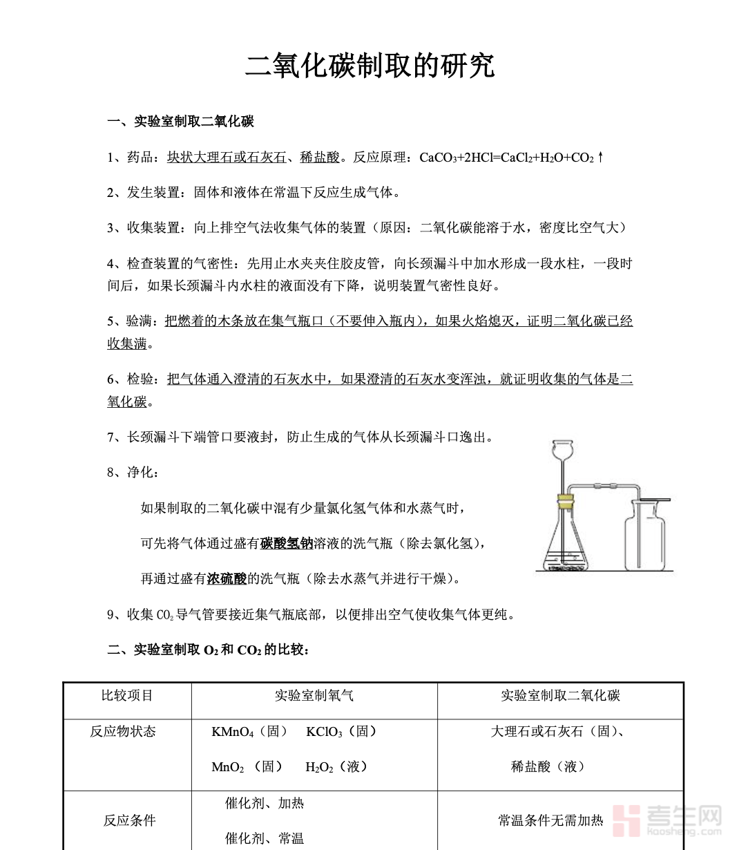 本资料为初中化学 二氧化碳制取专题知识点总结,紧扣教材与中考核心考点,系统讲解实验室制取二氧化碳的完整内容。重点梳理反应原理、药品选择、实验装置、收集方法、检验与验满操作,同时对比氧气制取,明确装置差异与选择依据。内容包含实验注意事项、易错点分析、常见问题解答,结合典型例题强化理解与应用。资料条理清晰、重点突出、简洁实用,适合课堂同步学习、课后巩固、实验复习及考前查漏补缺,帮助学生扎实掌握气体制取思路,提升实验分析与解题能力,为初中化学实验学习打下坚实基础。