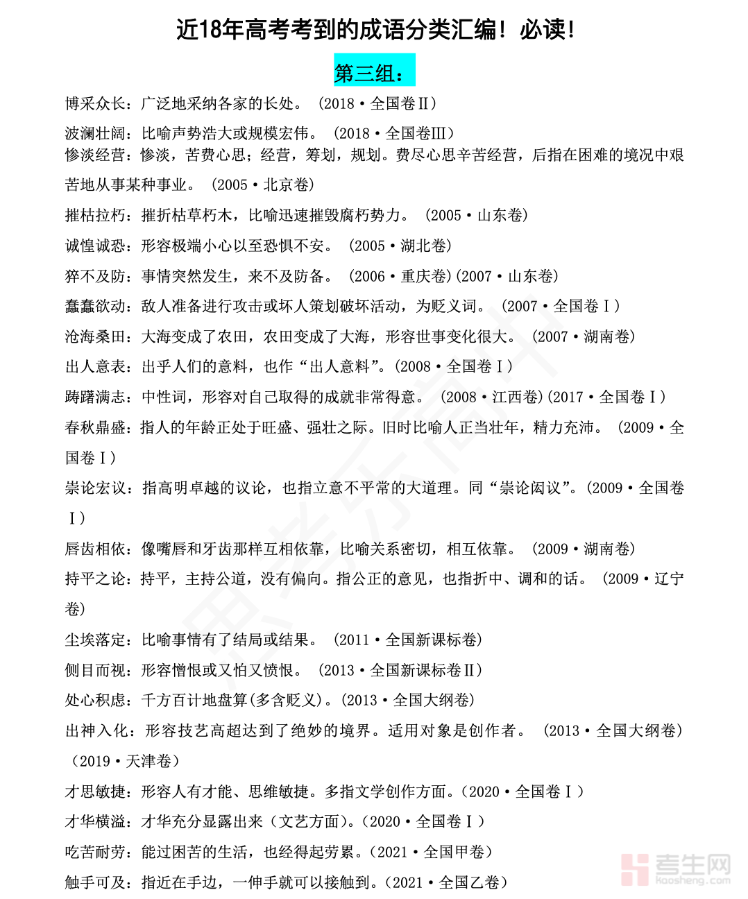 本资料为近 10 年必考语文正课成语汇编,依据全国中考真题与教材高频考点整理,收录多年持续考查的核心成语。每则成语标注释义、用法、感情色彩及易错点,重点区分近义、易混成语,搭配典型例句与考场误用提醒,贴合基础题、阅读、写作等多场景使用。内容精简、重点突出、实用性强,方便学生快速记忆、规范运用。适合日常积累、专项训练、考前冲刺与查漏补缺,助力学生扎实掌握成语考点,提升语言运用与应试得分能力,为语文备考提供高效实用的素材支持。