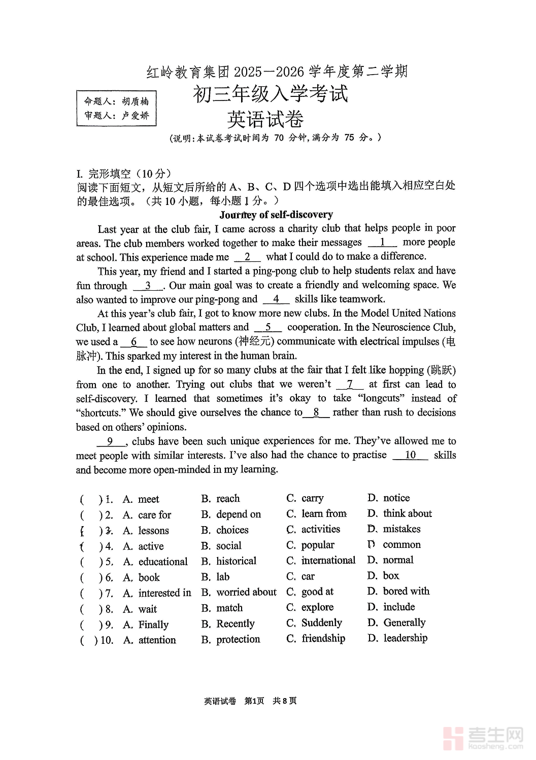 本资料为深圳市红岭教育集团 2025-2026 学年九年级下学期阶段自测英语试卷,依据深圳新中考英语命题趋势与九年级教学进度精心编制,适用于初三阶段性学情检测与巩固练习。试卷涵盖听力、单项选择、完形填空、阅读理解、语法填空、书面表达等全题型,紧扣教材核心知识点与中考高频考点,注重基础知识、语言运用及读写能力的综合考查。题型规范、难度适中,贴合初三复习阶段训练要求。既可用于课堂自测、学情摸底,也可供学生自主练习、查漏补缺,帮助学生及时发现薄弱环节,为后续英语中考复习夯实基础、提升应试能力。