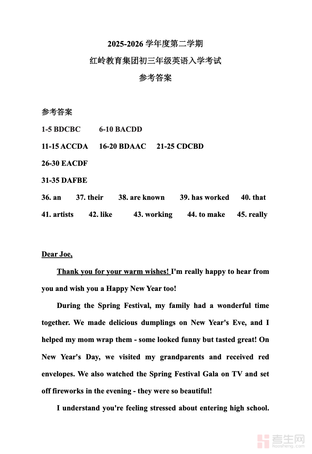本资料为深圳市红岭教育集团 2025-2026 学年九年级下学期阶段自测英语试卷,依据深圳新中考英语命题趋势与九年级教学进度精心编制,适用于初三阶段性学情检测与巩固练习。试卷涵盖听力、单项选择、完形填空、阅读理解、语法填空、书面表达等全题型,紧扣教材核心知识点与中考高频考点,注重基础知识、语言运用及读写能力的综合考查。题型规范、难度适中,贴合初三复习阶段训练要求。既可用于课堂自测、学情摸底,也可供学生自主练习、查漏补缺,帮助学生及时发现薄弱环节,为后续英语中考复习夯实基础、提升应试能力。