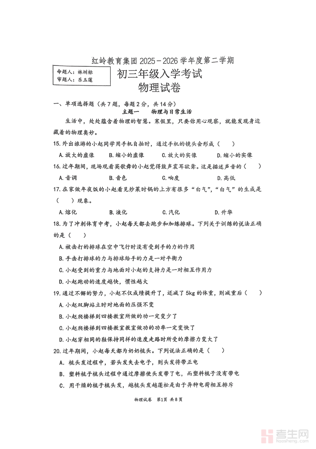 本资料为深圳市红岭教育集团 2025-2026 学年下学期九年级开学考物理试卷,依据深圳本地教学进度与新中考物理命题趋势编写,适用于初三下学期开学摸底与学情检测。试卷覆盖力学、光学、热学、电学等初中物理核心模块,侧重基础概念、公式应用、实验探究与典型模型考查,题型包括选择、填空、作图、实验探究、计算等,结构规范、难度适中。试卷贴合初三复习起步阶段要求,既可用于学校统一考试,也可供学生自主练习、查漏补缺,帮助学生快速梳理知识薄弱点,明确新学期复习方向,为中考物理备考夯实基础、提升解题能力。