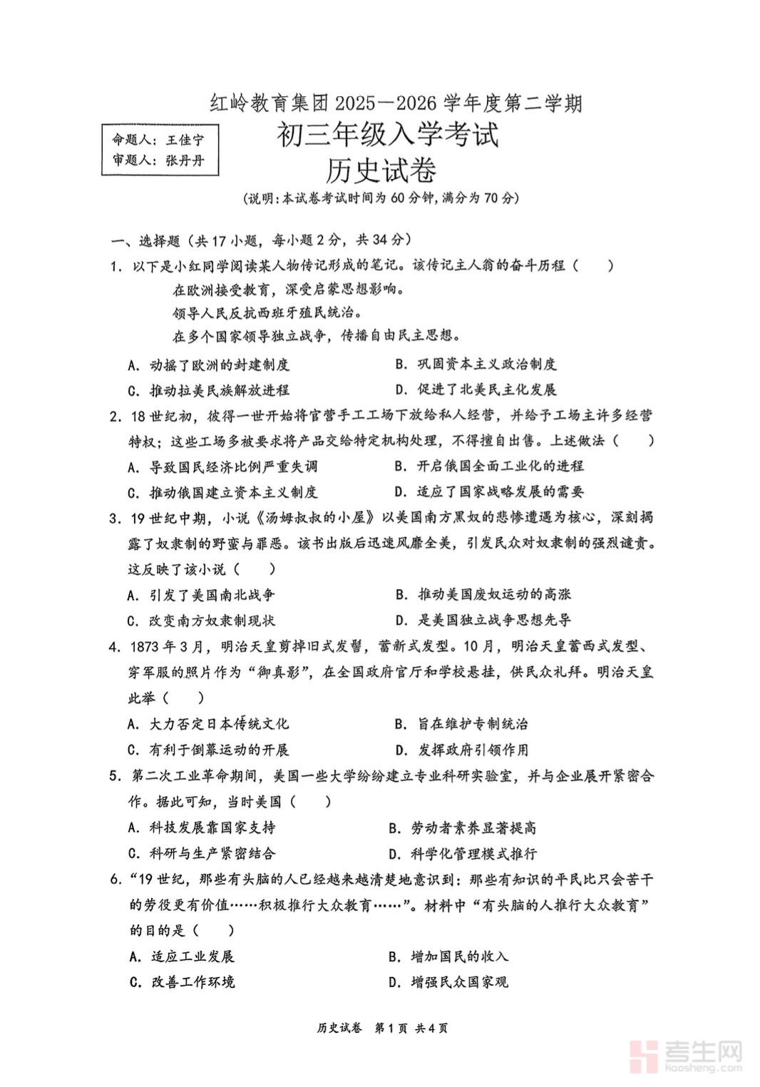 本资料为深圳市红岭教育集团 2025-2026 学年下学期九年级开学考历史试卷,依据深圳新中考历史考纲与初三教学进度命制,适合九年级下学期开学摸底与学情自测。试卷涵盖中国近现代史、世界近现代史等核心模块,注重时序观念、史料实证、历史理解与核心考点考查,题型包含选择题、材料分析题、简答题等,结构规范、难度适中。试卷贴合初三复习阶段特点,既可用于学校统一测评,也可供学生自主练习、查漏补缺,帮助学生快速梳理知识薄弱环节,明确新学期历史复习方向,为中考历史备考夯实基础、提升解题与应试能力。