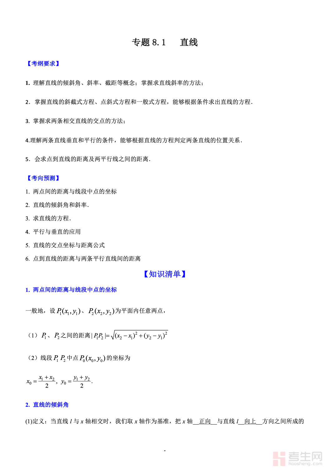 本资料为8.1 直线 高考数学一轮艺体生基础复习讲义(新高考)(学生版),专为艺体生一轮复习设计,紧扣新高考考纲,突出基础优先、易学易懂。内容系统梳理直线的倾斜角与斜率、直线方程的五种形式、两直线平行与垂直、距离公式等核心考点,侧重基础题型与通法讲解,难度适中、循序渐进。讲义包含知识点梳理、典型例题、步骤详解、易错点提醒及配套练习,结构清晰、便于教师教学使用。助力艺体生快速夯实解析几何基础,掌握直线核心解题思路,提升一轮复习效率,为高考数学备考打下扎实根基。